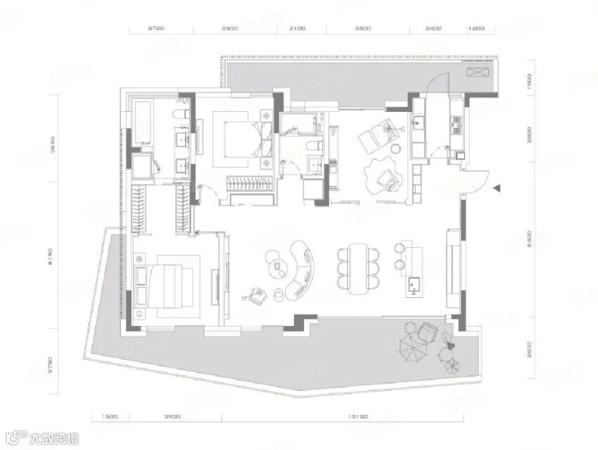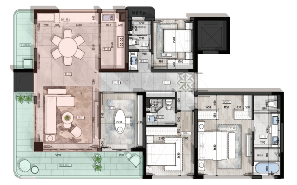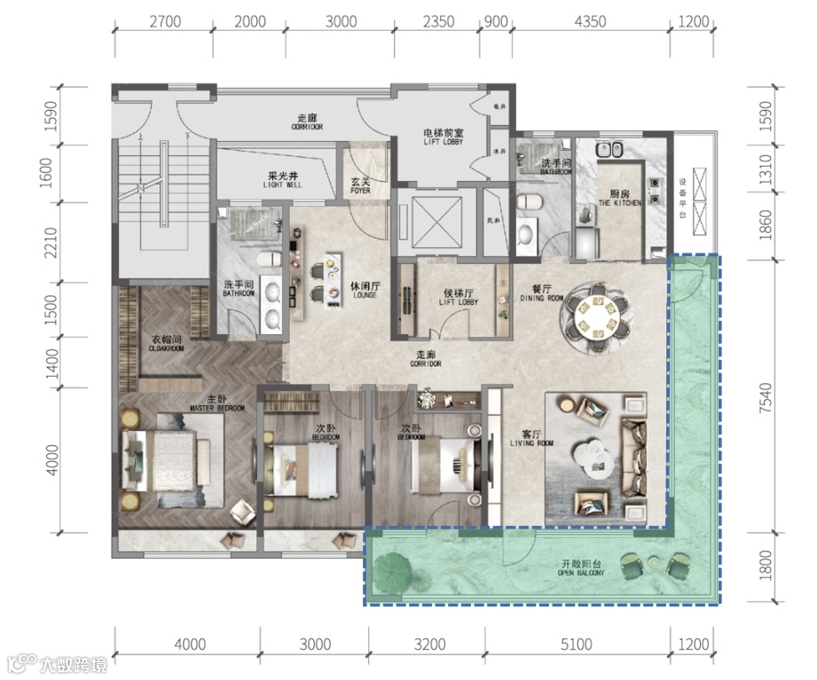 济南绿地·御山台建面约189平方大平层,一梯一户独有的电梯厅,有效保证生活私密与隐蔽性,约19米270°拐角大阳台,约16.5米南向四面宽,阳光可以毫无阻碍的照拂每处角落。