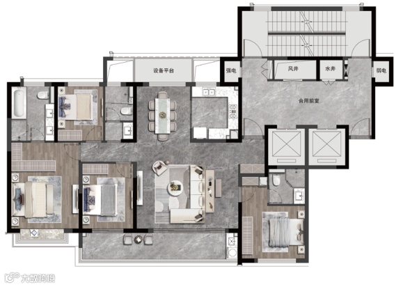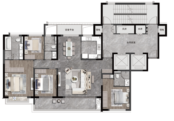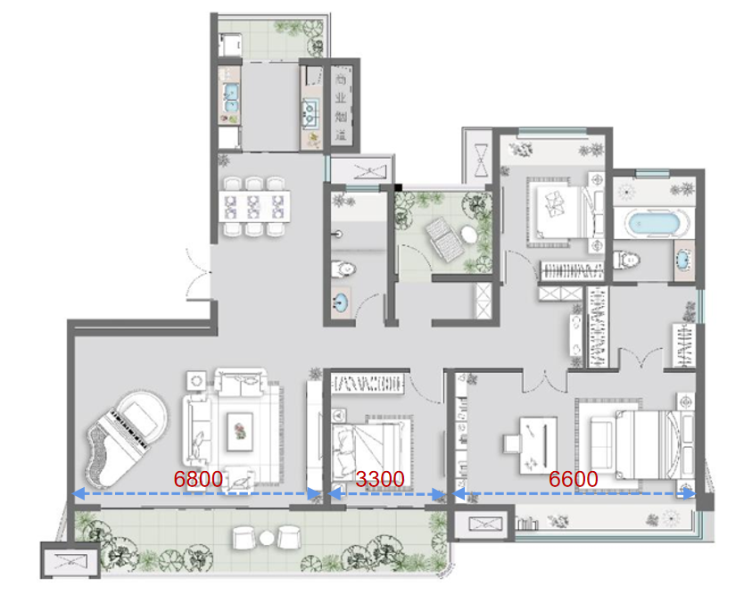南向四开间设计,约7米开放式宽境横厅,拉长升了整个空间的尺度感与韵律感。
