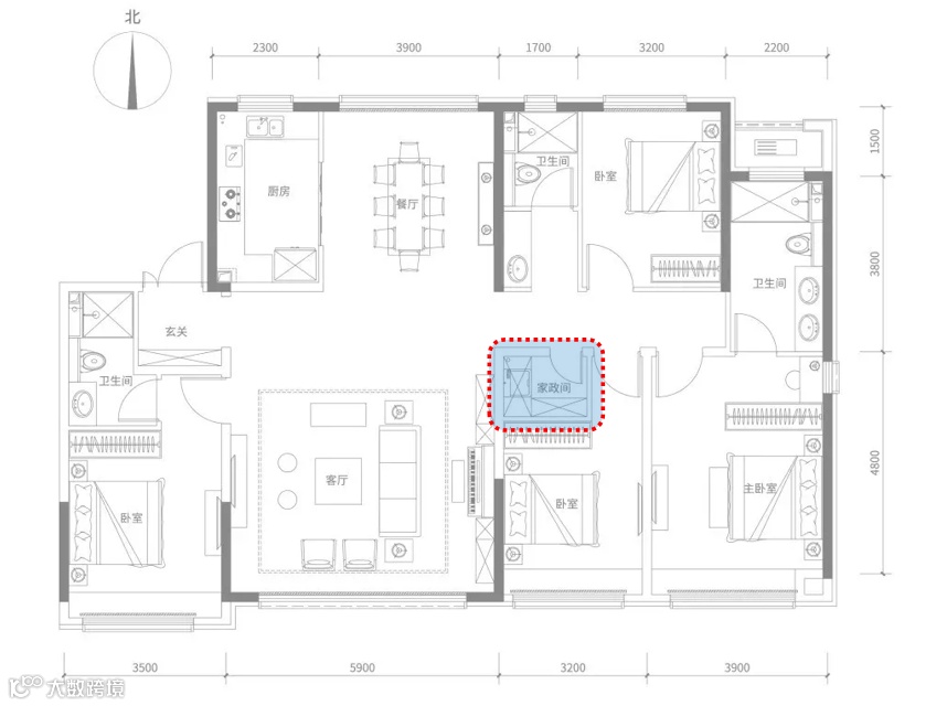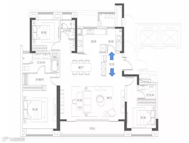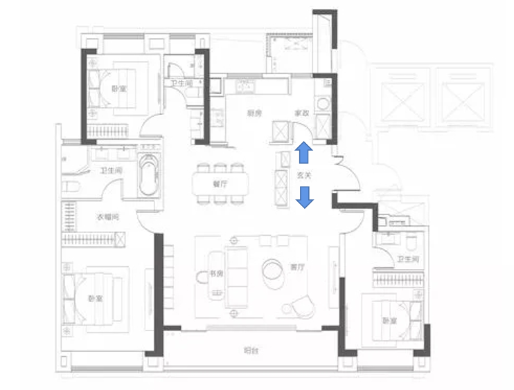 再看静区,南向双套房,北向公卫紧靠北侧次卧,3间卧室均衡配置。