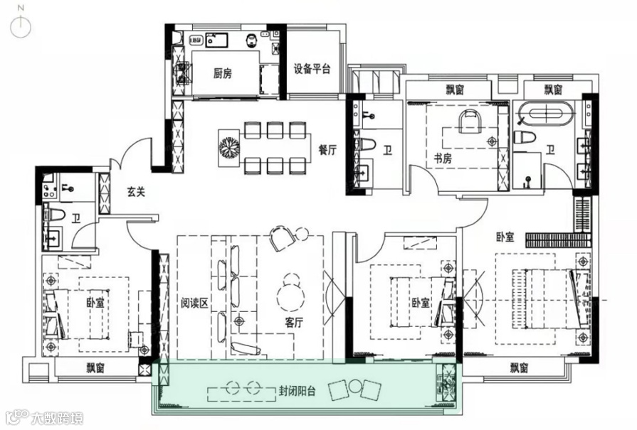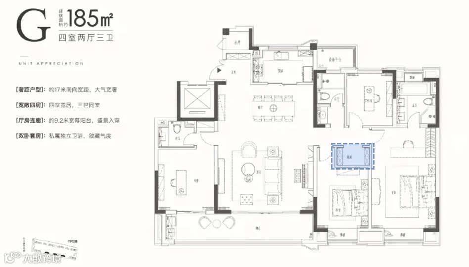 苏州华侨城龙湖·启元建筑面积约185㎡户型,四室两厅三卫,接近五开间朝南,大横厅、大阳台、大飘窗、大套房、入户独立玄关。关注经典人居