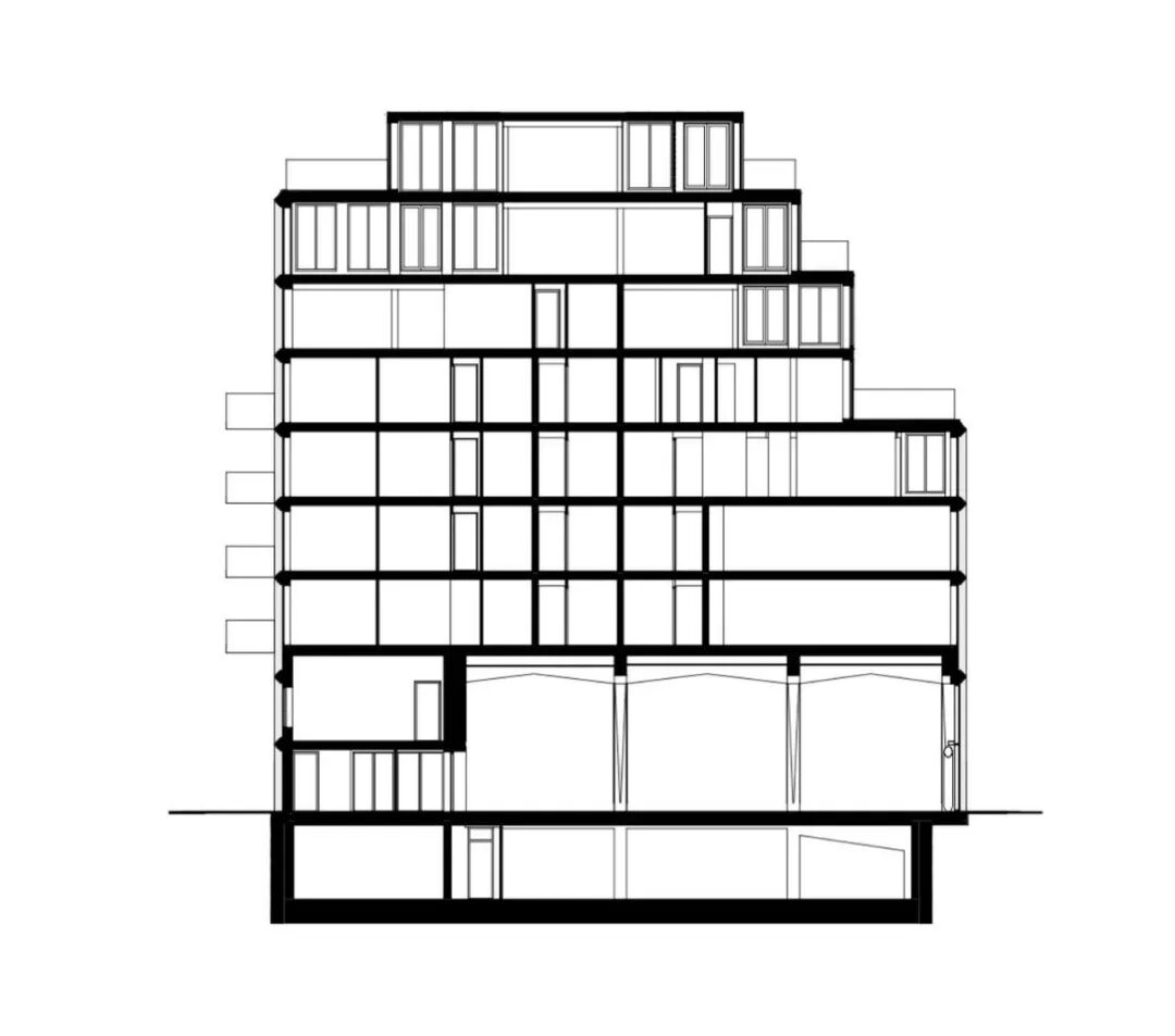In terms of scale, Mercado forms the link between Grote Markt and Rode Weeshuisstraat. The buildings on Grote Markt are of a larger scale than those on the north side of Rode Weeshuisstraat, including the Weeshuis (orphanage) itself. Mercado combines these scales in its stepped volume, which is high where possible and lower where necessary. The result is a building that fits perfectly into the city center in terms of scale yet has its own identity.