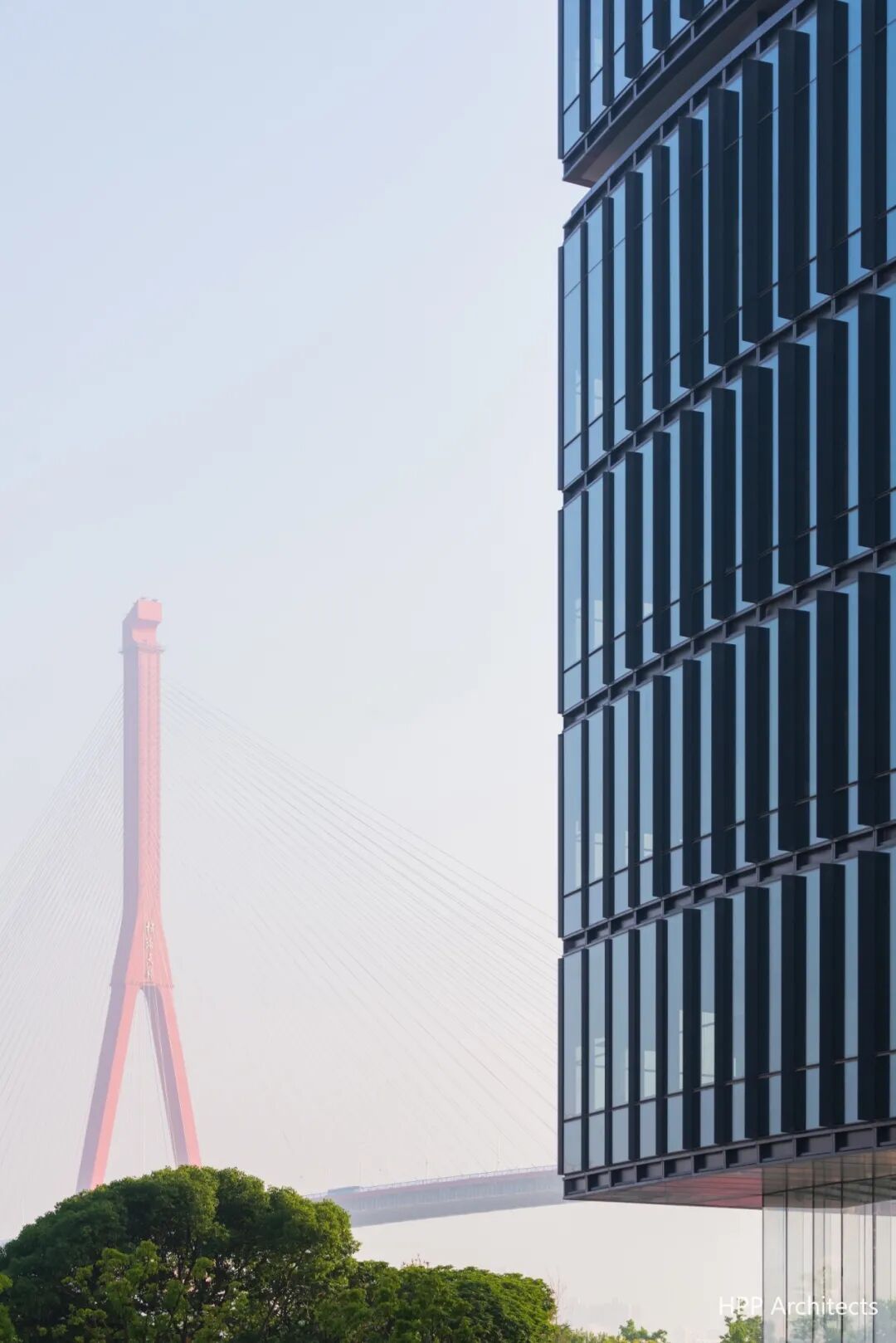 为了在高密度的城市里提供给使用者更广阔的城市景观界面,设计师决定设计两栋独立的办公塔楼,而不是一栋,来获得更多的视野面。建筑自上而下,依50米限高向下排列形体。同时设置结构夹层,用伸臂桁架上托下吊,把所有竖向力都通过核心筒传递至地下。在最大化江景视野的同时,使得首层空间与城市、绿地充分衔接,以一种开放的姿态融入周边。