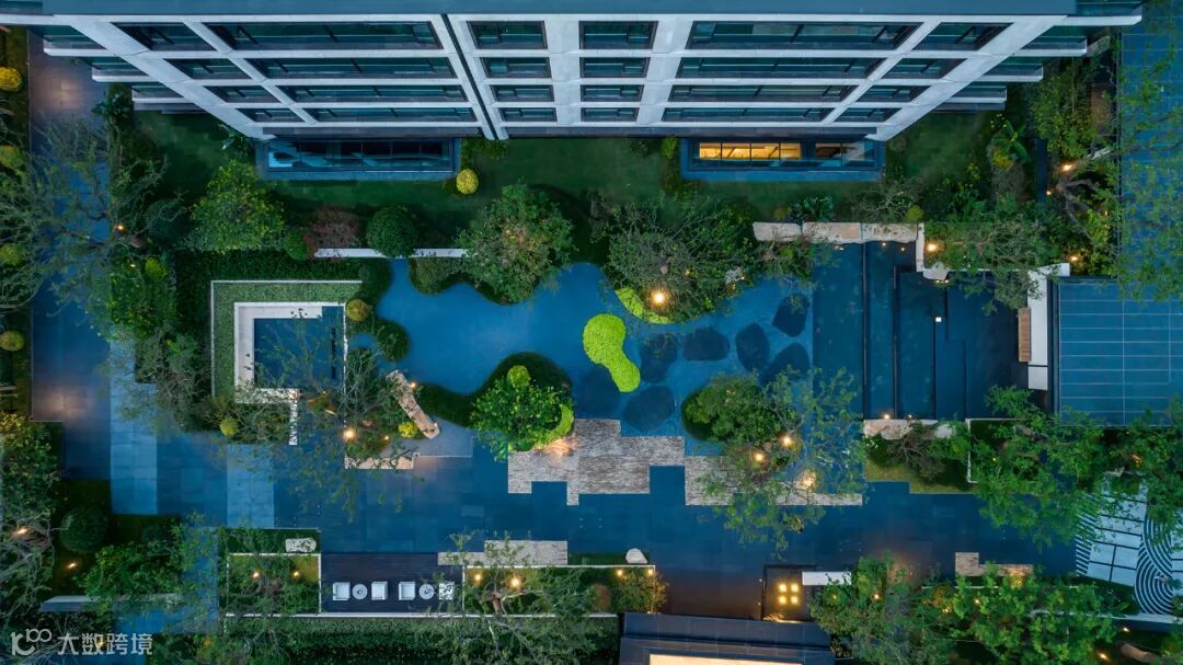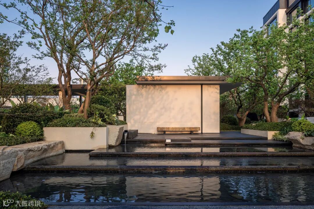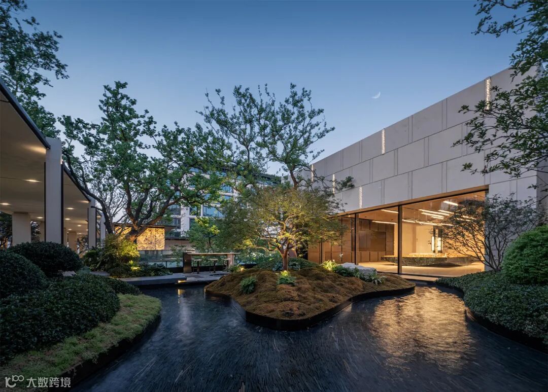 更叹为观止的是,约200㎡全水系下沉溪谷庭院,乌桕、叠瀑、绿岛、汀步……原生隐奢,超具东方美学的山水诗篇。