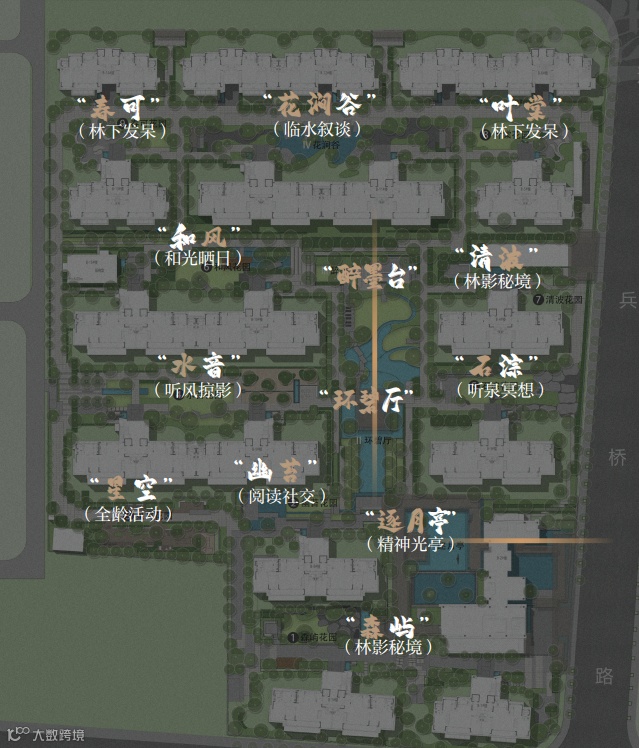 九大主题宅间名园,分别以紫薇、油松、红枫、梅花、乌桕、桂花、玉兰、海棠等名木花草为主题,打造森屿、幽苔、星月、水音、石淙、和风、清波、春可、叶棠等宅间花园意境。