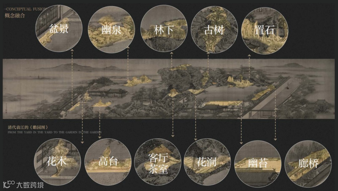 瞻月府因地制宜,师法瞻园,并参照清代袁江的《瞻园图》进行概念融合,复兴金陵雅韵,以现代手法表达东方意蕴:置名石、布名水、植名木、一环一轴,兼容并蓄,典藏名园,整体布局以瞻园归家礼序和宅间名园为精髓,演绎出了美轮美奂,虽由人作,宛自天开的园林意境,内部达到约2万方园景,“含园量”超高。