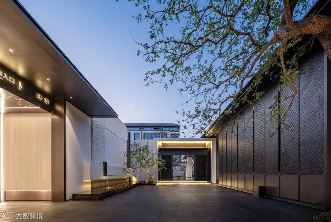 穿过大门而入,迎面照壁一块自然莱姆石悬于空中,搭配高山流水,寓意“开门见水,遇水生财”,借自然万物之灵性,为业主带来归家美感及祝愿,两棵造型绝美的乌桕,宛若“巨型”精致盆景,迎客而立。