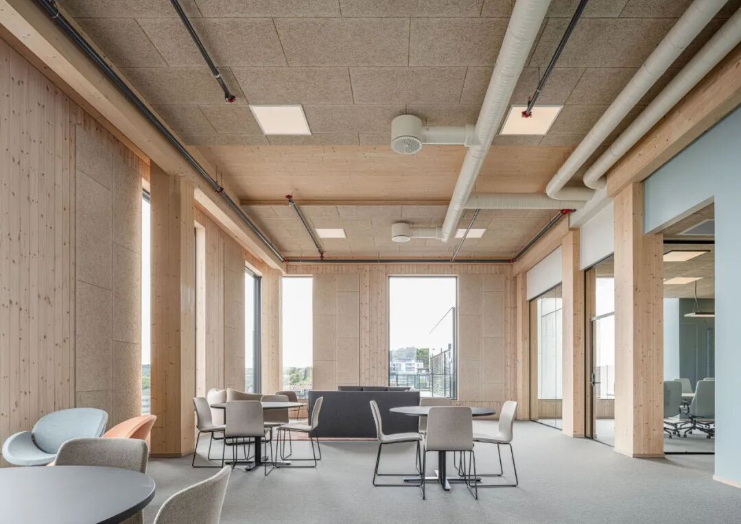 The facade is composed of prefabricated curved wooden elements in pine, treated with green paint. The eaves above the curved elements are straight, creating a curved shadow on the panel. Over time, the paint under the shadow will weather, leading to a changing facade with lighter and darker curved sections. The insulation used throughout is wood fiber. The cladding consists of fire-treated pine. All load-bearing structures are exposed, and exterior walls are clad with white-pigmented spruce panels. Wood wool acoustic panels are used in concealed service areas and meeting rooms. Visible conduits are painted in a light beige color. The large floor-to-ceiling windows open up to the view and provide ample natural light.