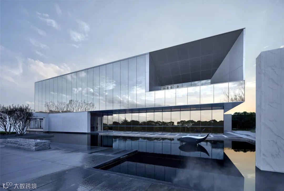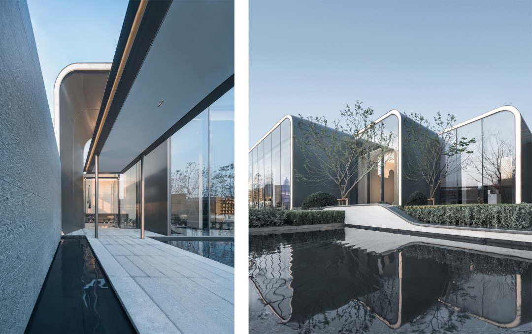 杭源里“超流体”艺术生活馆,作为其概念缩影,圆角曲线的外边缘采用超薄的蜂窝铝板包裹石材肌理的亚克力板,暗藏有LED灯,夜晚透光,大面积超白玻璃幕墙与水环境叠加,强化超流体建筑的反重力感。
