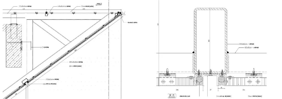 其后,经过多轮构造方式比选后,采用后段线条铝板弯折衔接前段弯弧线条的整体开模方式,将两段弯弧段线条焊接打磨,最终呈现平滑连续的线条效果。在施工精度控制上,前段弯弧采用工业精加工方式委托汽车生产厂家定制。