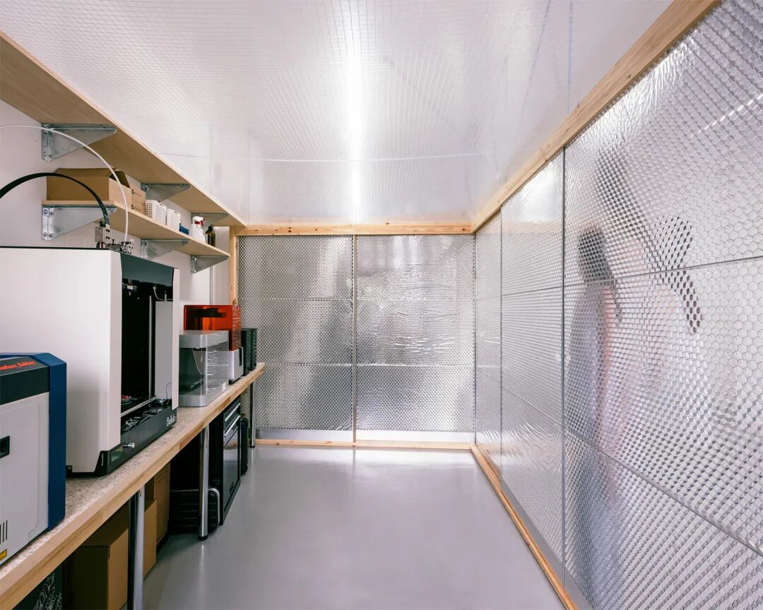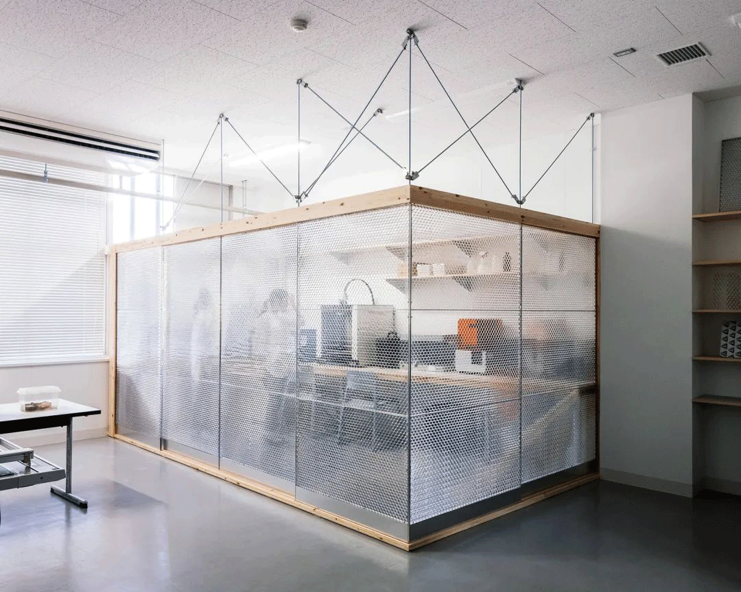 该项目是日本九州大学设计学院折纸工程实验室进行的一次室内设计实践,旨在利用新开发的“折纸型”铝制蜂窝板制作日式滑动门,并在室内搭建一个封闭的小型数字制造车间。