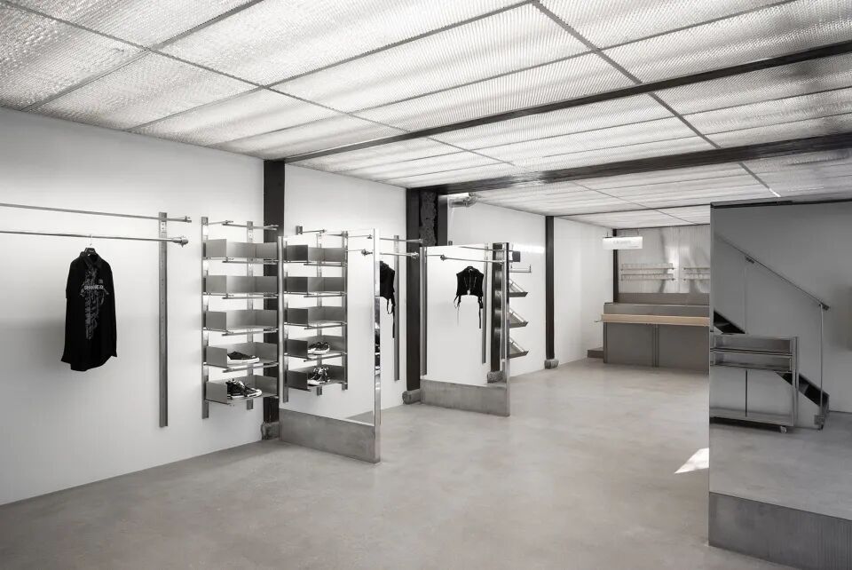 上海延平路上的in the Park门店内,轻盈且坚硬的环形置物架轻盈由蜂窝铝板制成,表面附上木皮和石漆,增添自然与工业的呼应。