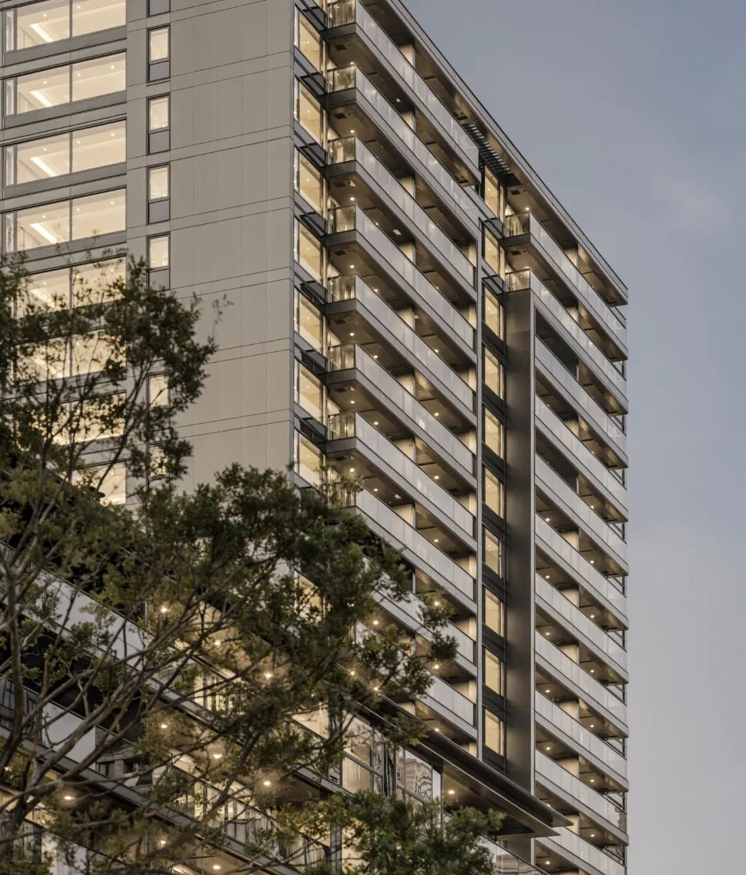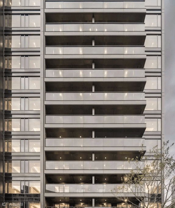 杭州沁园项目外立面采用了蜂窝铝板与深色欧洲灰玻璃,利用铝型材的细腻勾勒出蜂窝铝板与大面low-e玻璃的通透几何形态。