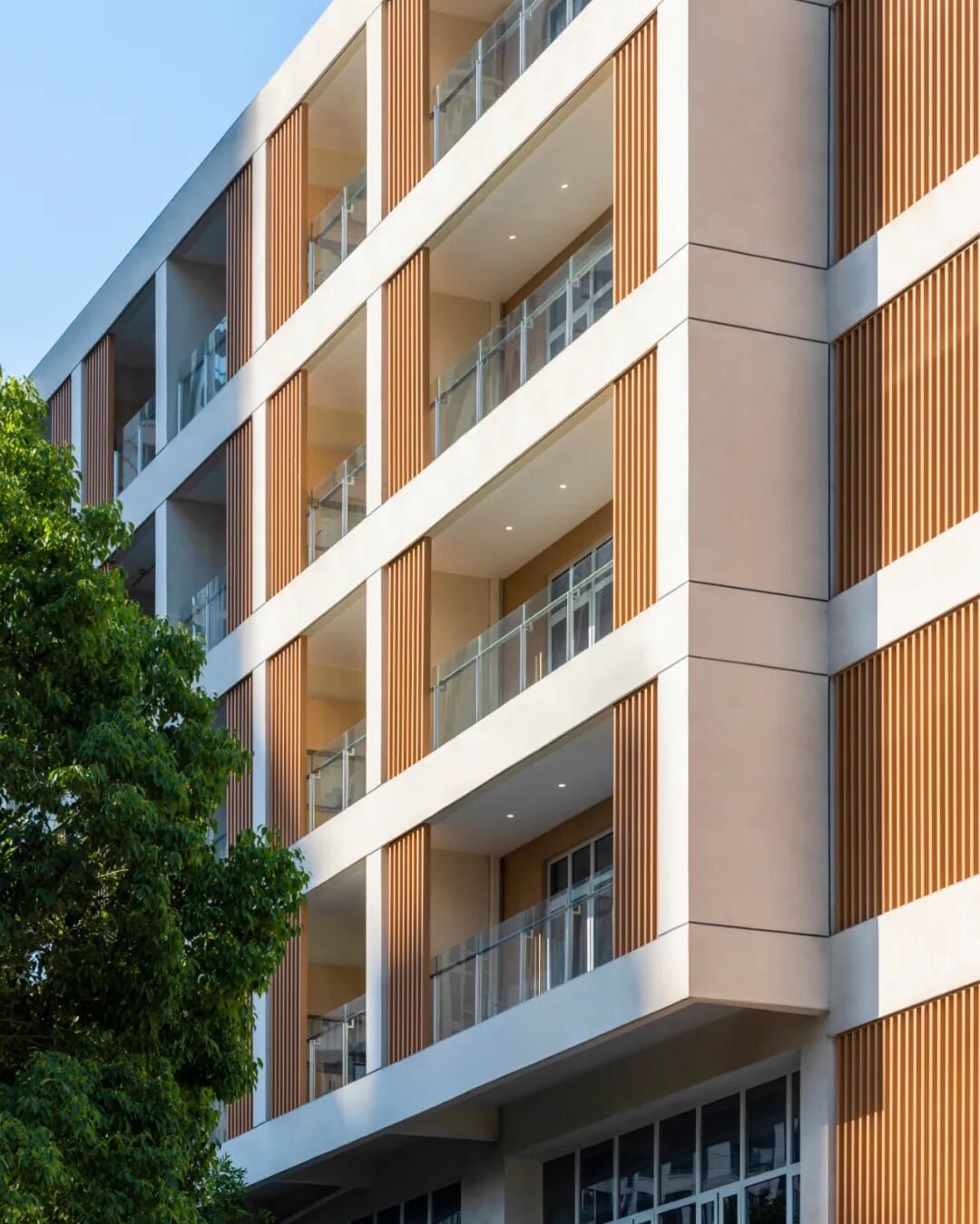 安康城市气候适宜,四季气温舒适,所以在每户养老单元都有自己的户外阳台,从窗户望出去美丽的景色和城市尽收眼底。阳台的进退阴影关系和立面竖向的木色方通,成为建筑外立面简约的构成关系的要素,同时为阳台产生一定的庇护感。