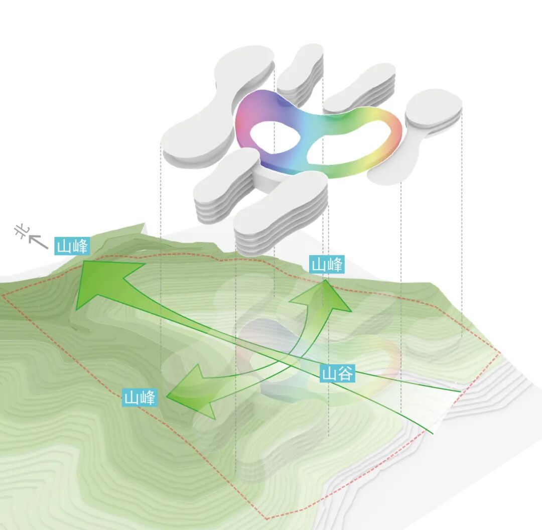 STEP3:在山谷中引入共享空间“彩虹之环”,将整个校园从横向以及竖向全方位联系起来。