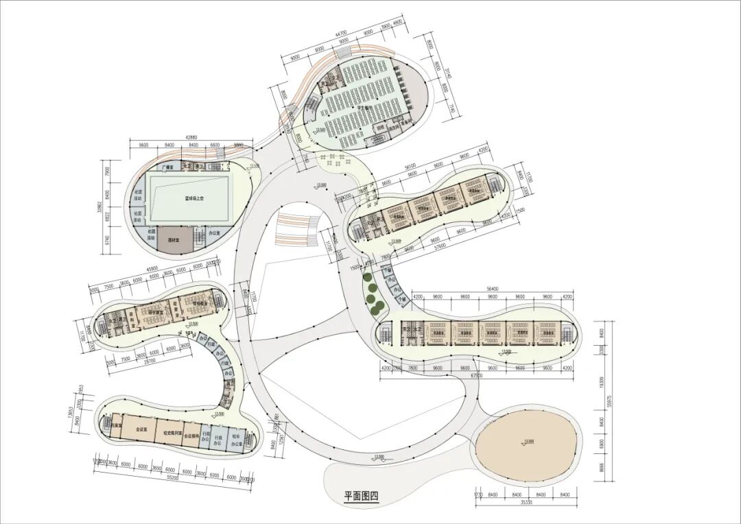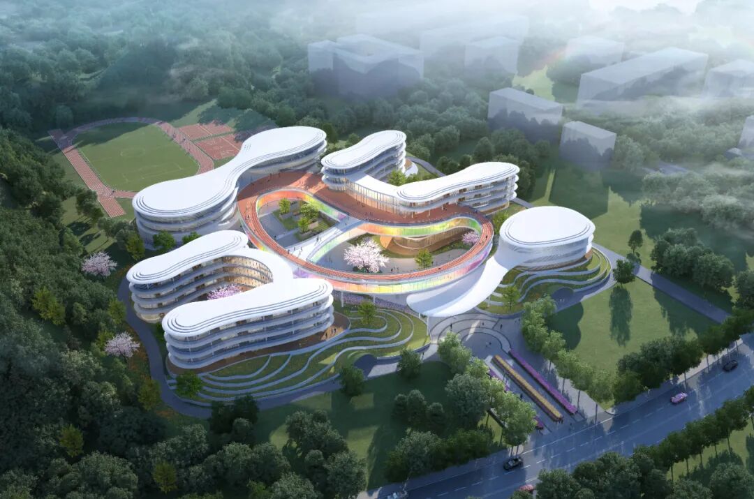 校园中部连接各个建筑的彩虹之环,形成无障碍共享平台,使学生在短暂的课间十分钟也有就近交流活动的场所。