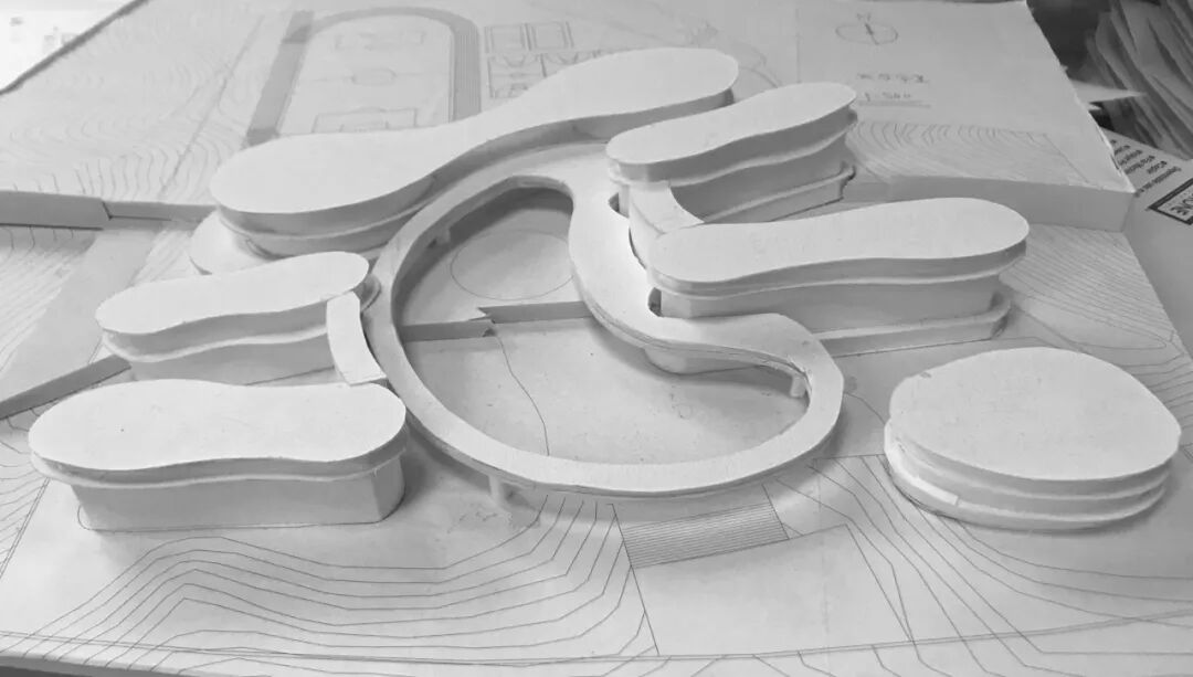 STEP2:云朵状教学用房顺着地块的走势错落分布在东西北三侧,自南向北建筑依次抬高,呈现出“空谷流云”之势;