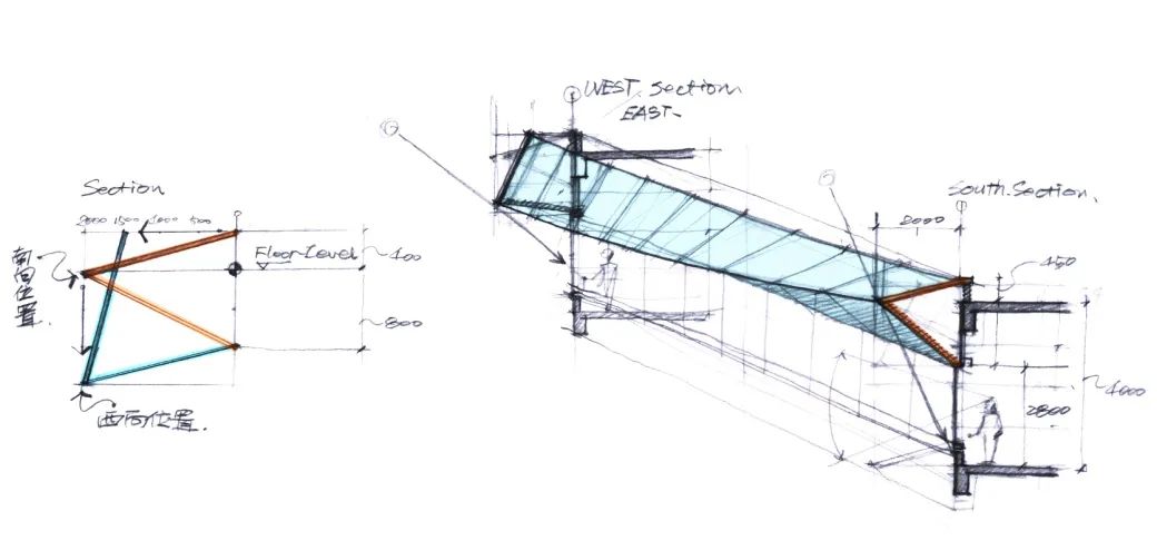 东西侧高1.5m的梯形截面扭转渐变为南侧高0.5m的三角形截面,给人以 “横看成岭侧成峰”的观感。