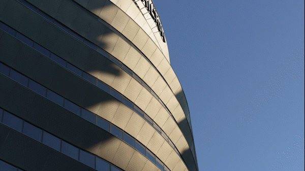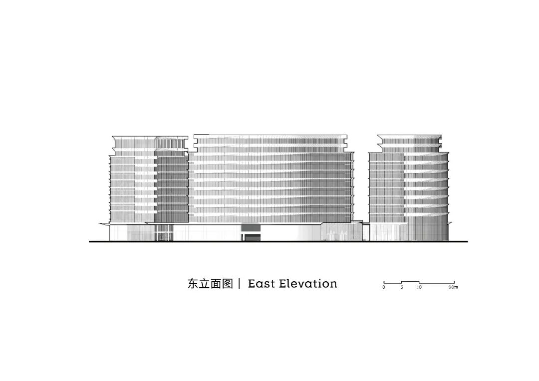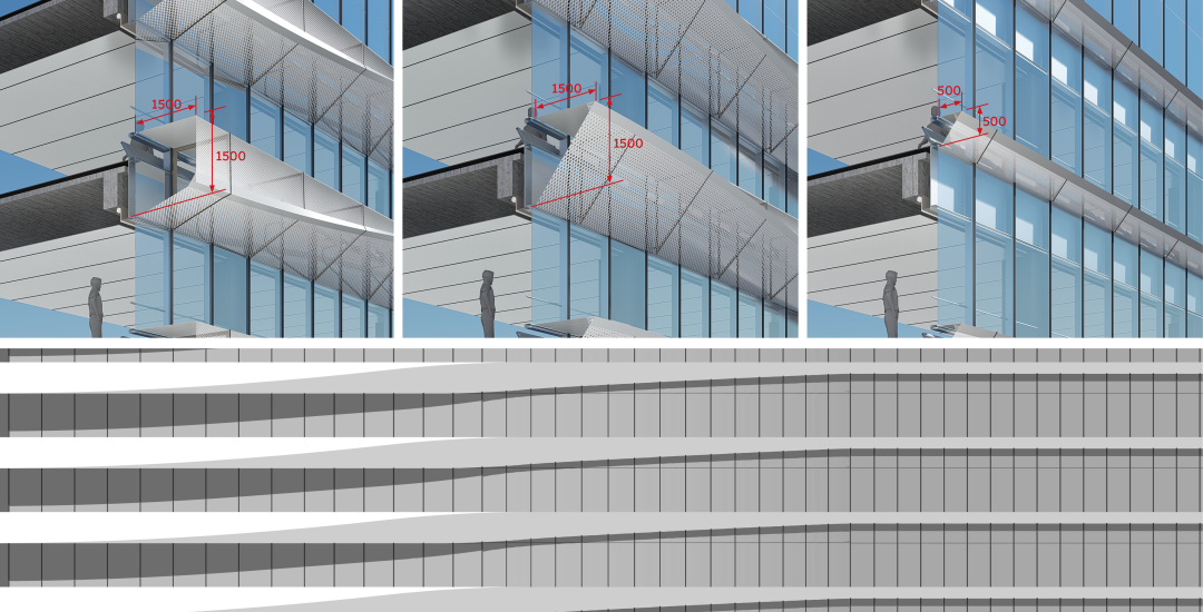 最终的建筑立面体现了形式感与功能性的融合。结合弯弧体量的几何特征、隐藏开启扇的需求,建筑师采用横向铝板构件作为建筑立面的主要要素。为同时满足建筑不同朝向部位的差异性需求——西侧趋避西晒、南侧引入日照,建筑师对出挑1.2m的铝板构件做出三维扭转处理。