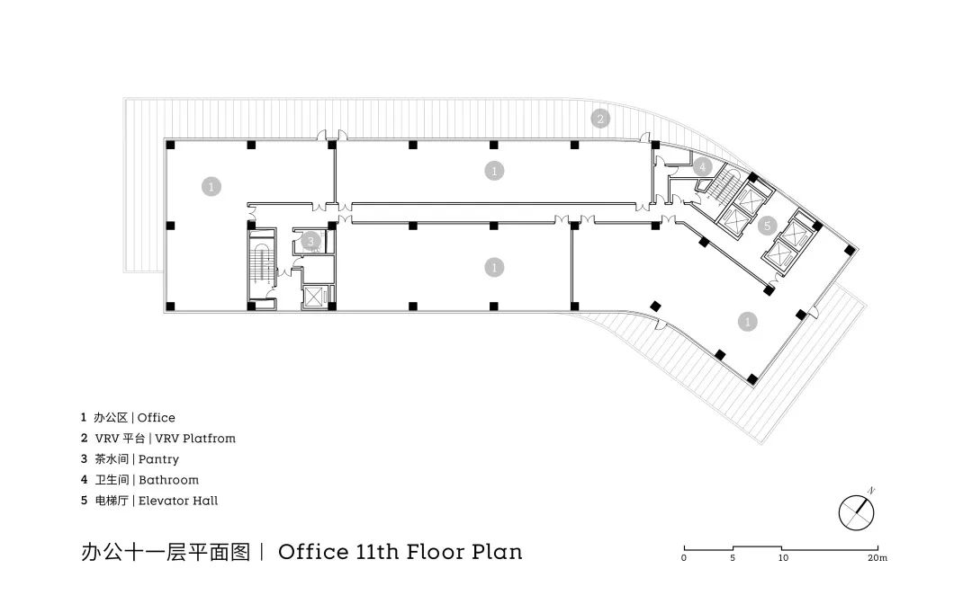 为规避对视影响,建筑师将核心筒布置于建筑中的相对消极空间——楼栋间距最近的转角处。为强化“峡谷”的空间层次,建筑师在3层、11层高度设计了局部退台,种植绿色植物,为办公人群提供工作之余放松身心的平台。