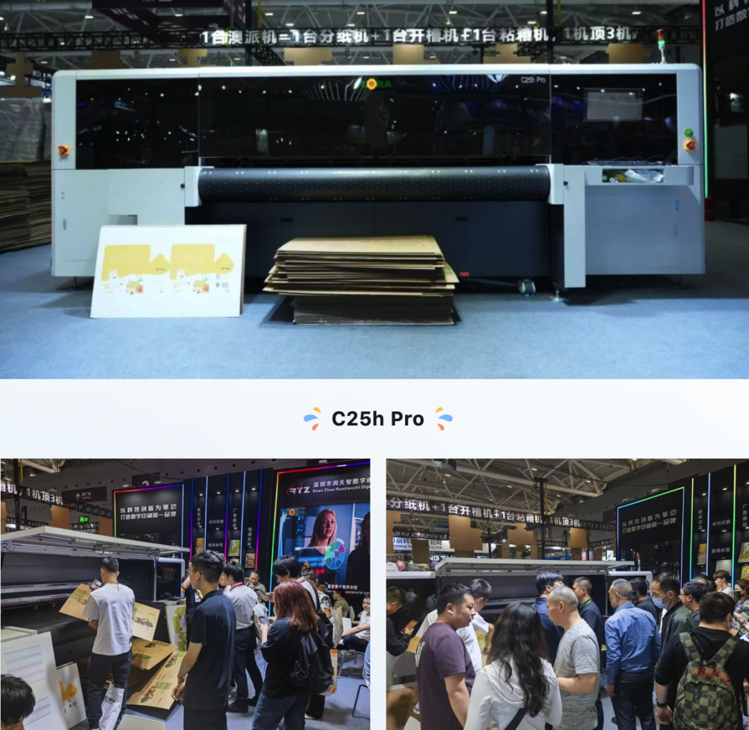 展会现场另一款彩神C25h Pro瓦楞纸数包装码印刷机的表现同样亮眼,通过打通生产前后工序,实现了全自动送纸模块与生产线的联接,自动化连线带来更高的生产、时间、成本效益。