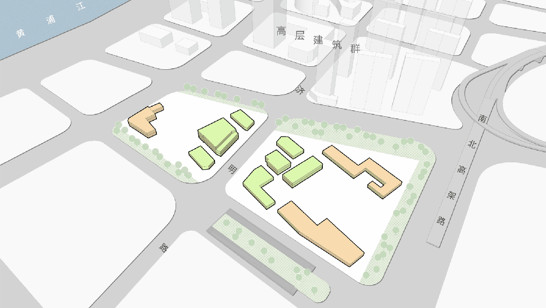 项目基地用地内部被济明路分为东西两部分,且西侧具有滨江景观,东侧紧邻南北高架承担城市界面的功能。为更好地利用城市资源,将用地回馈给城市,同时为使用者提供最佳的使用感受,规划对用地的整体空间开放度进行了层层分析并落位相应功能区。