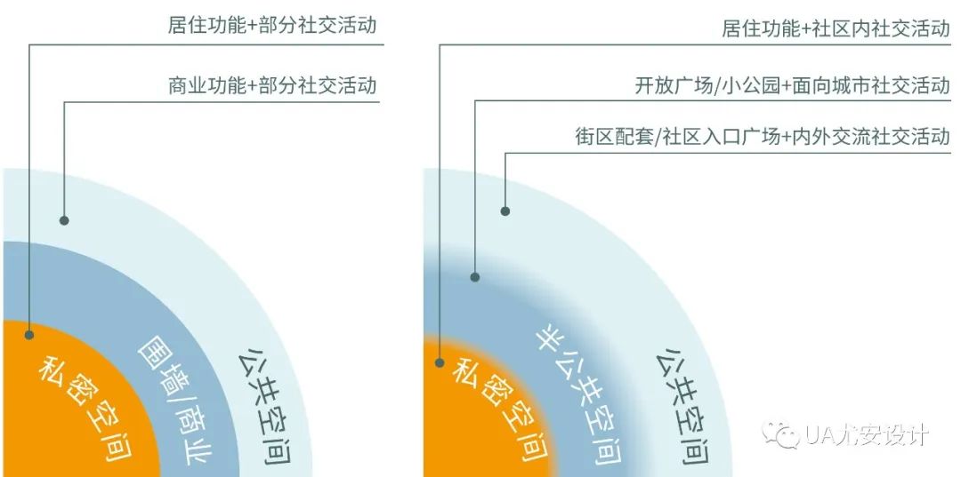 传统封闭社区常常形成封闭的洋葱皮式结构,封闭社区几乎将所有用地划为内部私用,把开放空间挤到街道上;通过人为的割裂,居住者的活动分为了两部分-小区内/小区外,缺乏心理过渡,也不利于社区活跃。为实现城市与社区进一步的互动,提升城市归属感,租赁住房的规划设计更进一步推动社区街区开放化理念,提高公共开放空间的比例,增加半公共空间的空间层次,将居民活动还原成连续自然的过程,顺应城市的有——场地与外围活力核心、外部交通节点,补充城市的无——生活街区、生活氛围、小广场。