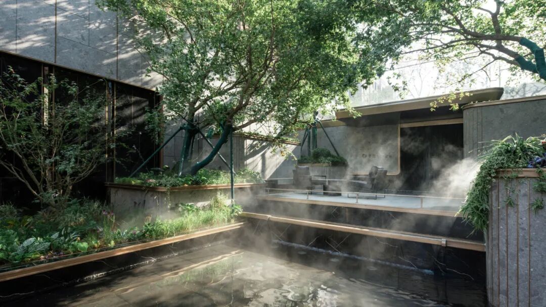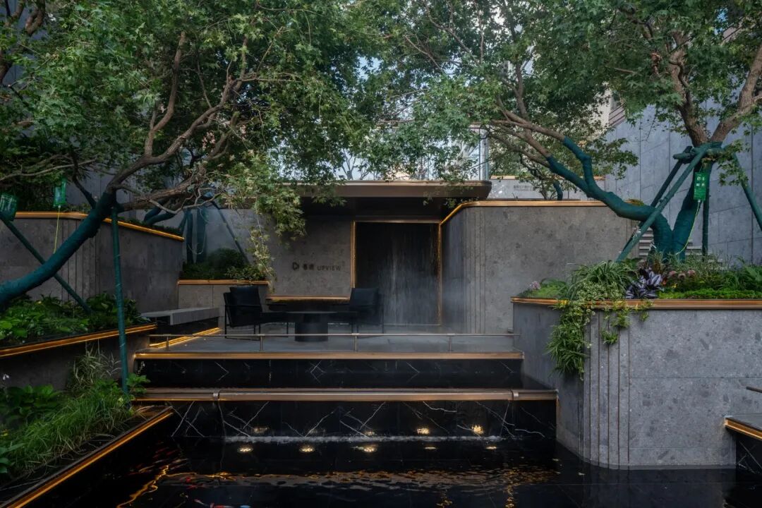 下沉庭院室外对景与室内布局呼应,建筑立面与景观语言统一。庭院通过‘山水伴行、出挑平台、植物掩映,打造丰富的景观触感体验,立面则由高感光全面屏打造,采用市面罕见的3.3m面宽的超尺度白玻璃,室内与室外视线无限延伸,创造无界自然。