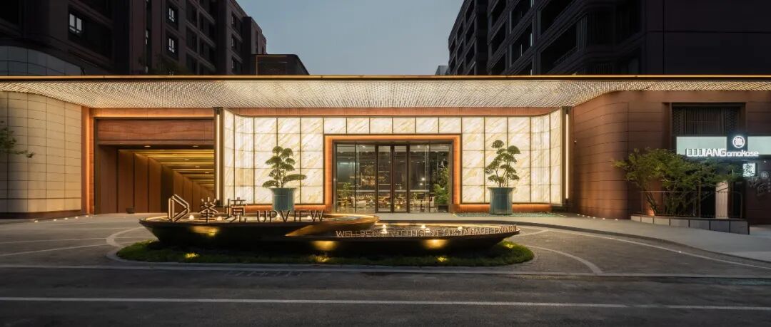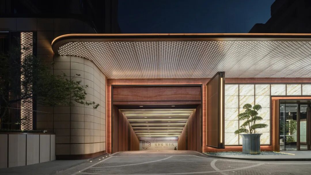 主墙面材料上采用红洞石材料作为背景,弧形墙面采用皇家白玉透光玉石,剔透的玉石屏风构成一体化的立面,呈现透亮又朦胧的意境,门头顶部则通过13种穿孔板孔隙率渐变,形成灯光的虚实变化,明暗过渡。