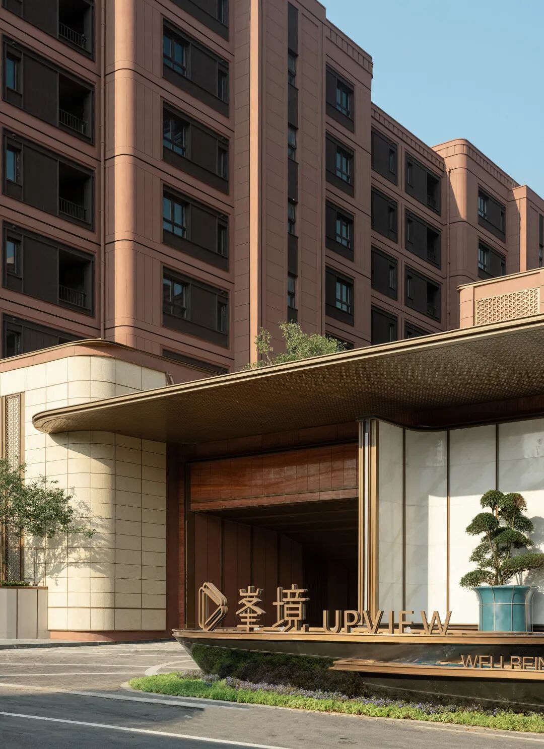 浪漫归家,花园入户——住宅入口和周边环境所组成的形态具备可识别性,绿意萦绕,缓步向上,顺山势而为的空间地形建造使入口空间的层次更加个性化,形成礼序、品质的单元入户空间。深咖色铝板衬托金色金属,凸显门头极致细节。