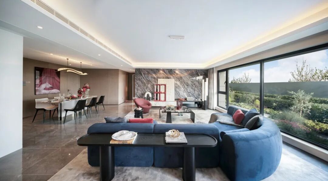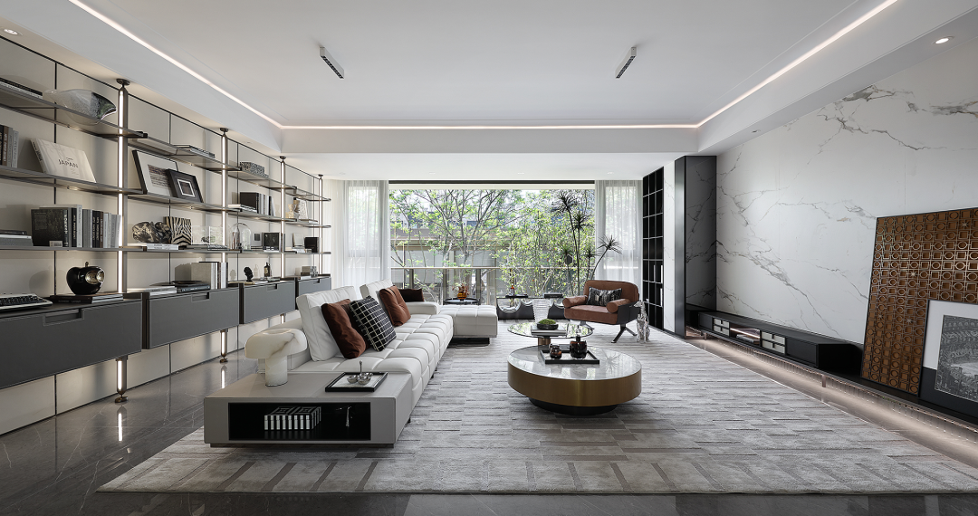 客厅约3.3米阔尺层高,登阶揽藏非凡情境。生活理念高度与建筑设计审美碰撞,以突破传统层高设计,兼得大面宽与奢阔层高,迎纳清风阳光,匹配生活品位与气度胸襟。