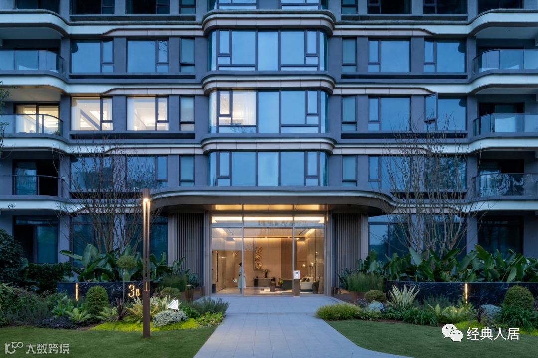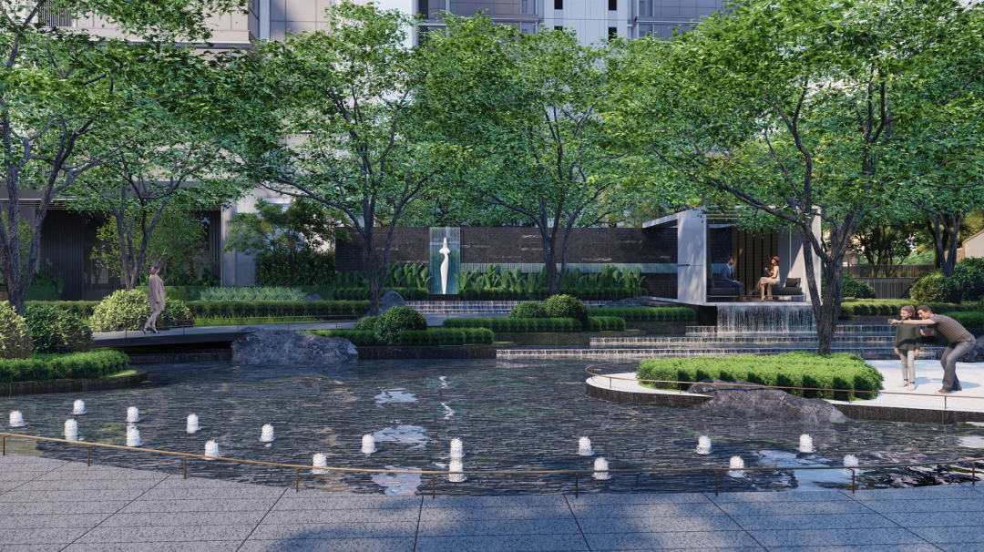 项目主入口位于基地东侧,以仪式水院—入口门廊—林荫水境—归家大堂—自然花园的线性归家巷道空间为动线,融合光、风、水等自然元素,构建三轴、二环、十二院的景观体系,营造出场景化的社区空间。构建闹市中的隐逸之所,公园里的幽闲之境。