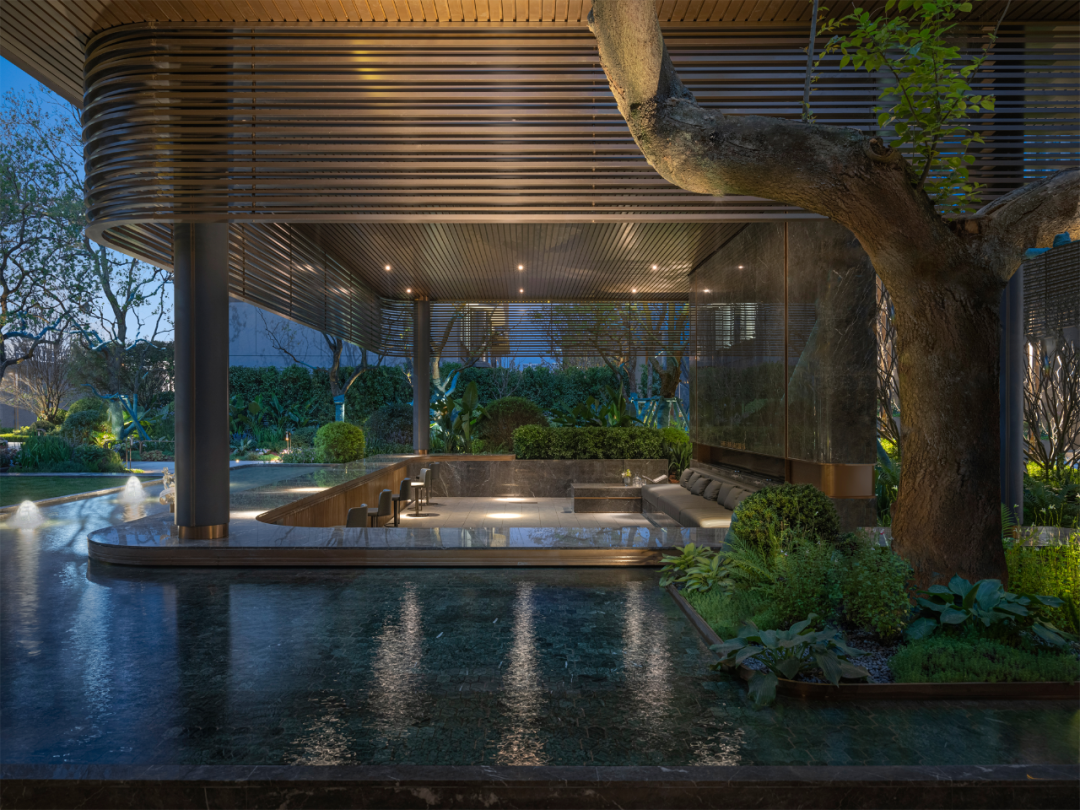 U型的空间围合下,多层级的动态水景与定制化弧形金属格栅形成进入社区后的视线焦点。照壁金属格栅做法上采用双层格栅,通过前后规格不同进行图案叠加,视觉上达到立体效果