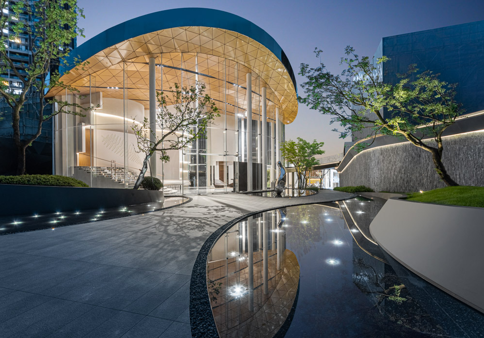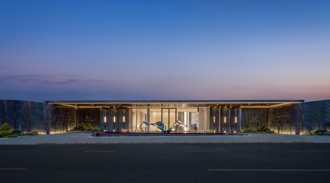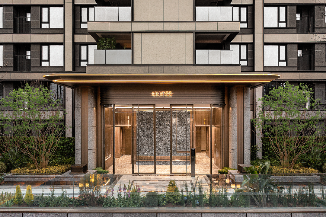 主入口区域作为项目的第一眼印象,也是城市街区的第一展示面,招商·新川臻境打造了约40m奢尺大门,质感材料和对称结构所产生的尊贵感。