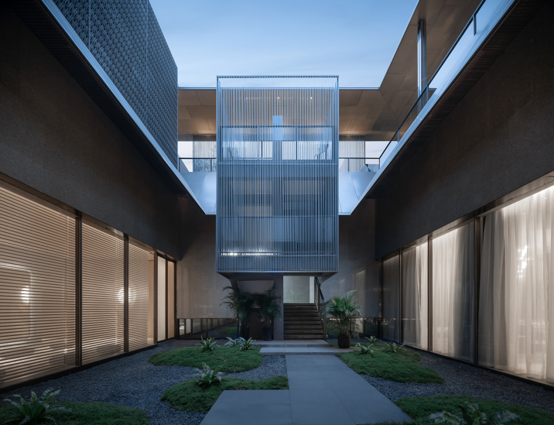 纯净的玻璃幕墙实现室内外空间的无界交流,构筑起展厅内游人的的思考、冥想、动静与平衡,予人清新舒适的视觉观感与心境体验。
