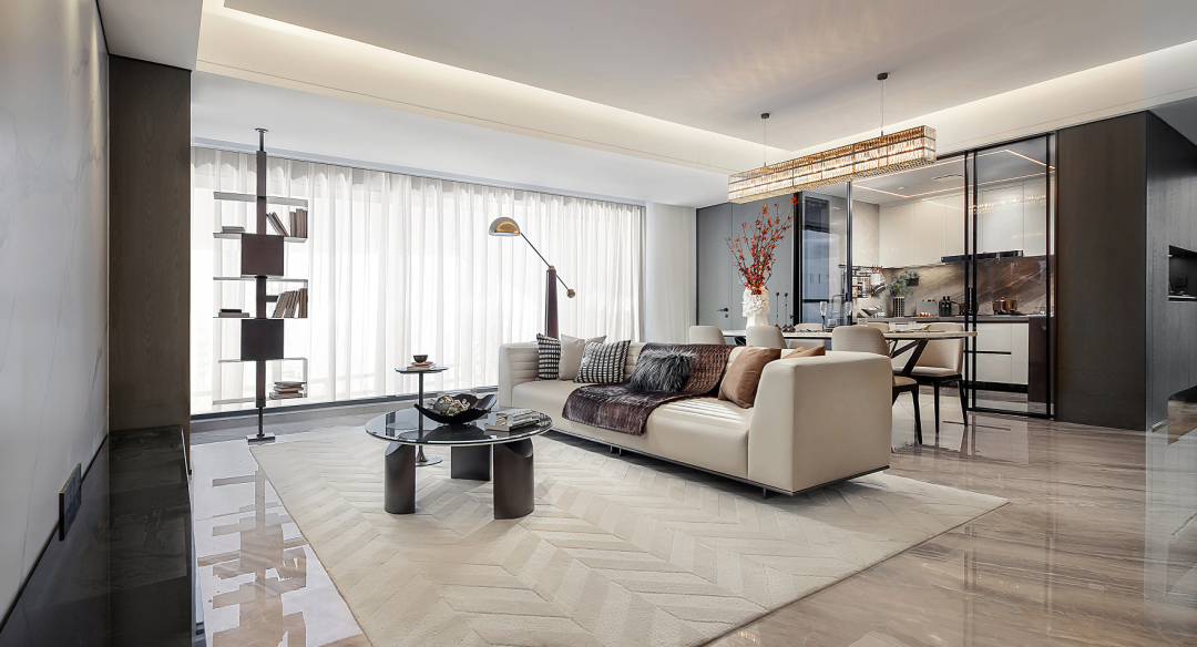 以东方美学现代化表达手法演绎室内装修风格,所有空间没有狭长过道多余浪费空间,客餐厅与超宽敞景观阳台连在一起扩大视线范围及人的活动空间,形成开敞、亲切的互动交流氛围,创造全家庭无界互动、交流空间,营造更旷达、从容、丰盈的生活哲学。