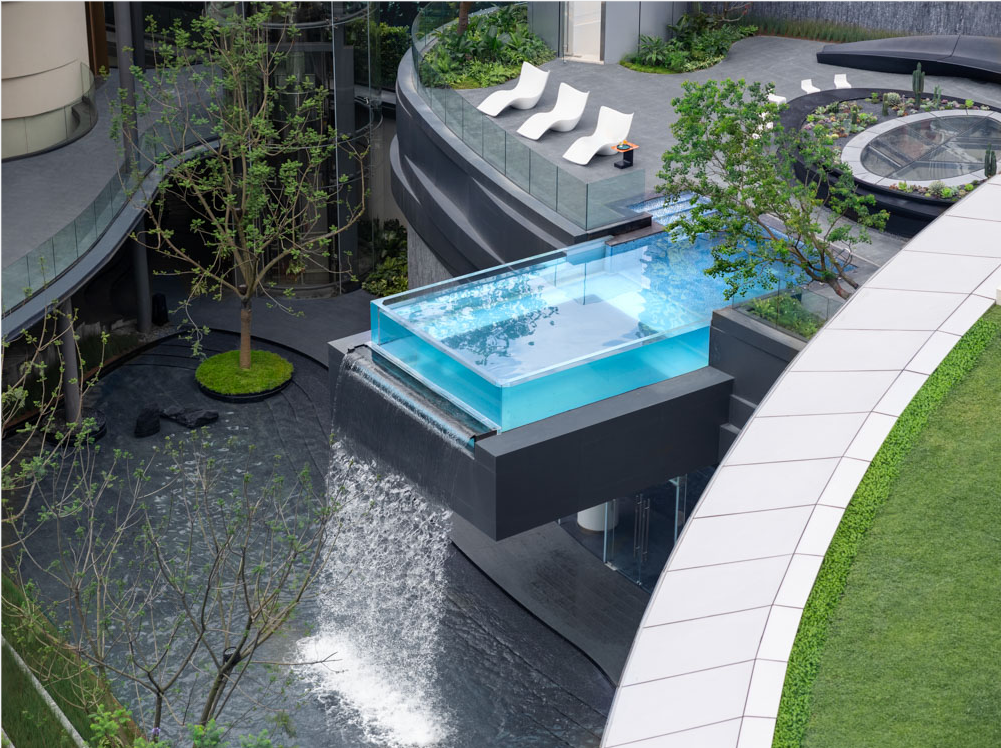 项目拟打造一个具有人文艺术、尊贵品质、生态自然、功能丰富的特色都市公园化宜居社区。根据归家动线依次设置艺术入口——森林中厅——宅间花园—入户前庭——入户大堂。利用场地原始高差打造多层次立体空间,生活化场景。4000㎡社区温度大中庭,精致的艺术跌水,与自然的林下氛围空间,提醒着你可以慢下来,感受精致“猫”系生活。