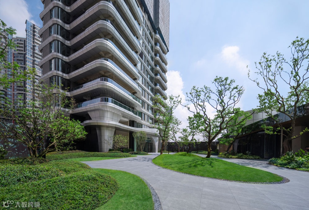 成都是平原城市,但项目别处心裁的使用高差打造出立体景观,也使得建筑轮廓以自然流畅的弧度为景观奠定了完美的曲线基底;以“一条峡谷、六座浮岛”为设计理念,楼栋之间错动交互,整体呈现三维立体生态系统。