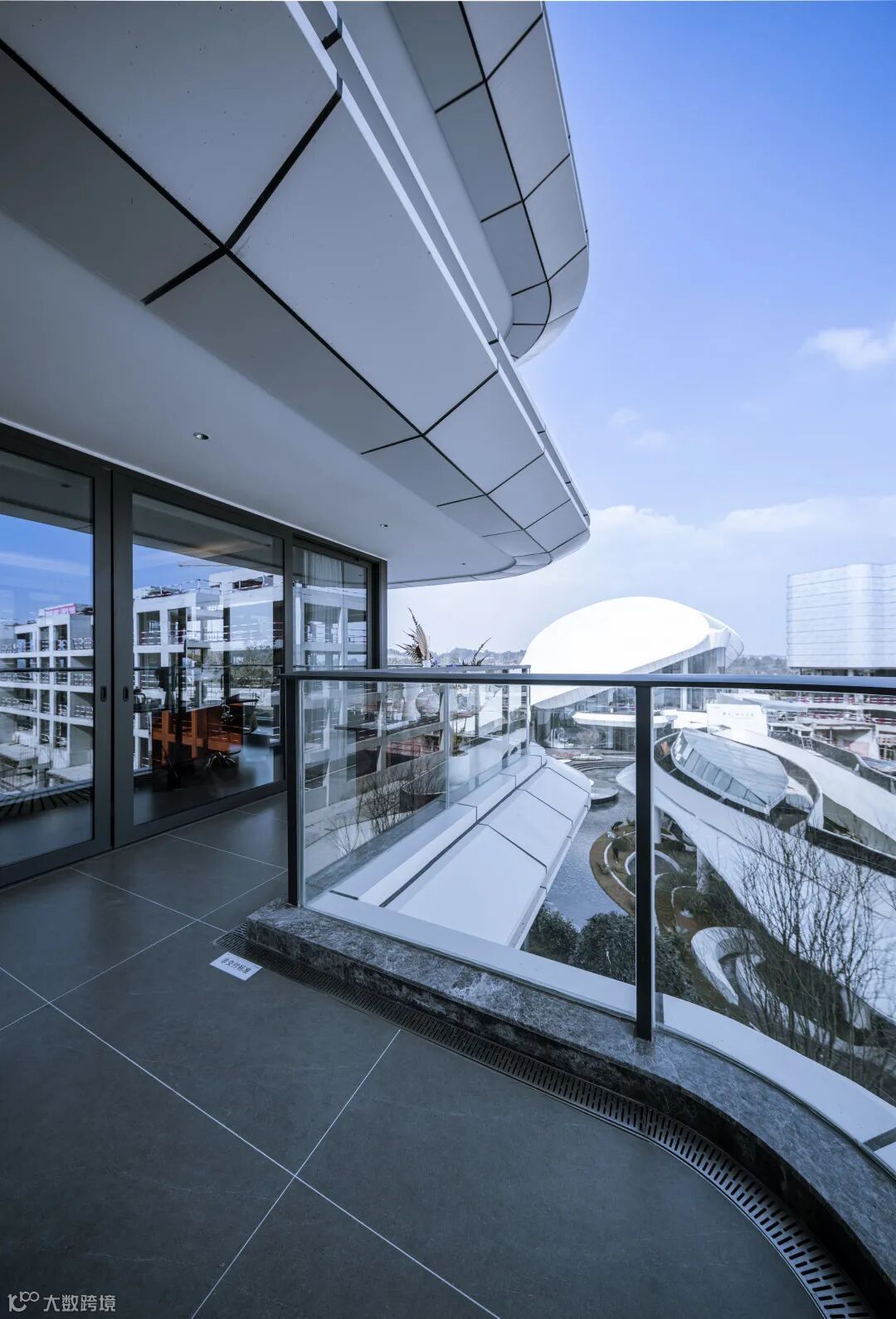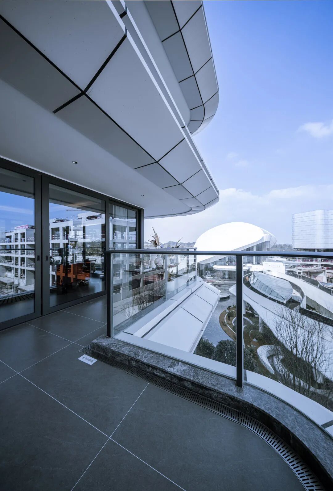 大面积LOW-E蓝灰玻璃、隐框玻璃栏板运用灰色和米白色外立面搭配香槟金极简线条,打造品质美学建筑群。