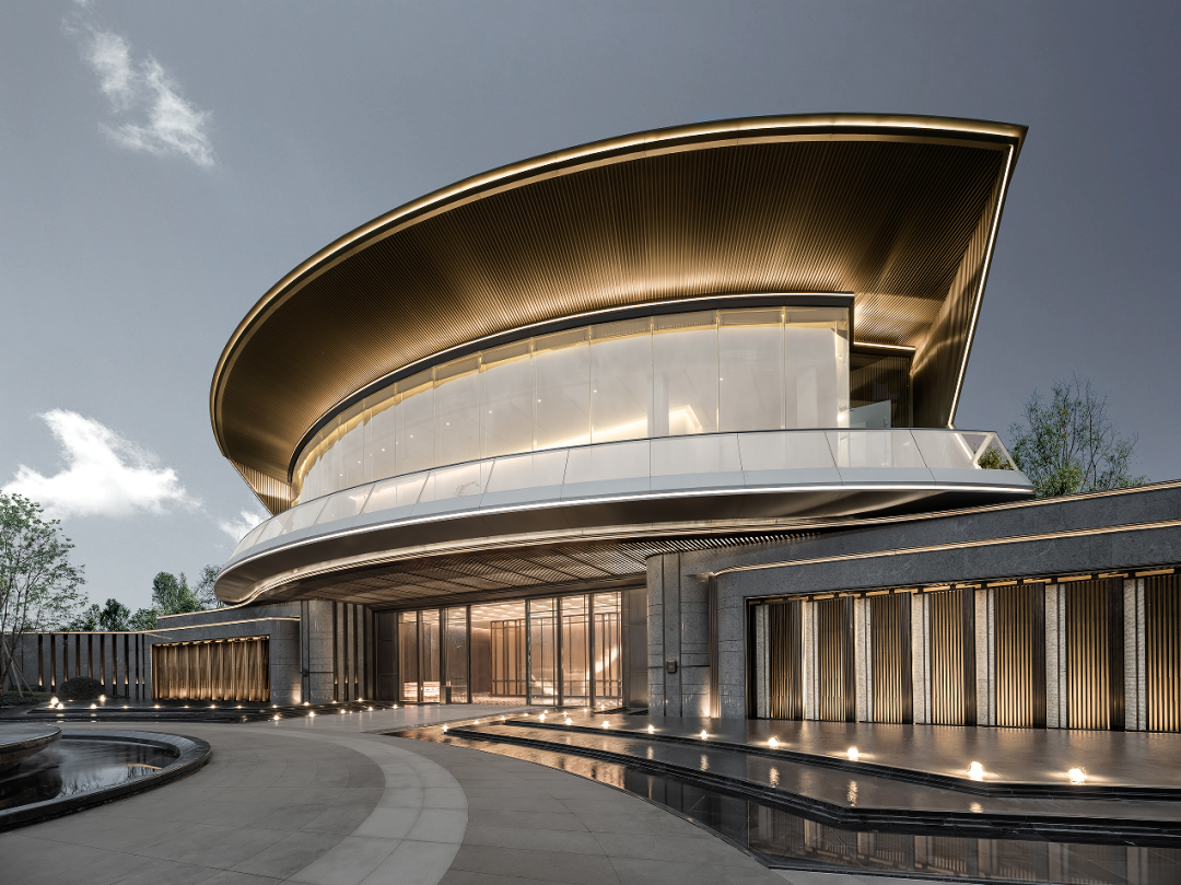 在建筑外立面上,招商·新川臻境采用香槟金线条造型作为视觉符号,搭配大面积通铺的LOW-E蓝灰玻璃。在不同的天气下,甚至会有差异化的视觉感受。