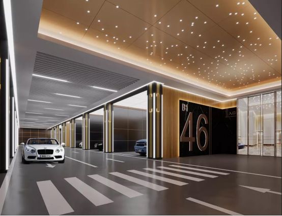 本项目地下车库层高达到4.2-5.8米,地库有私家停车库设计,车户比高达3.0,高品质双入户大堂设计,彰显极致豪宅品质。