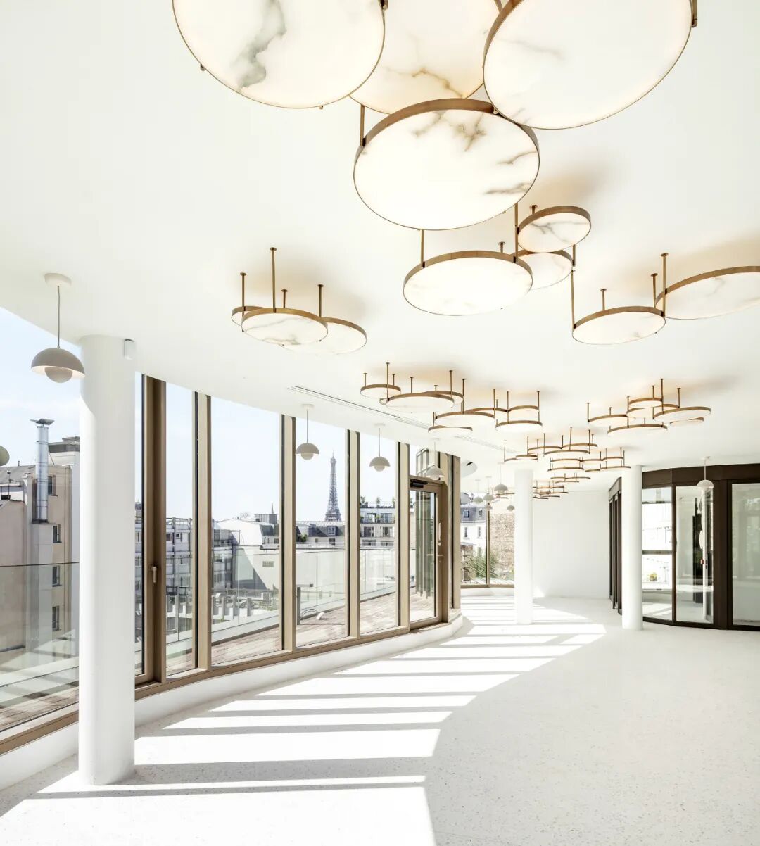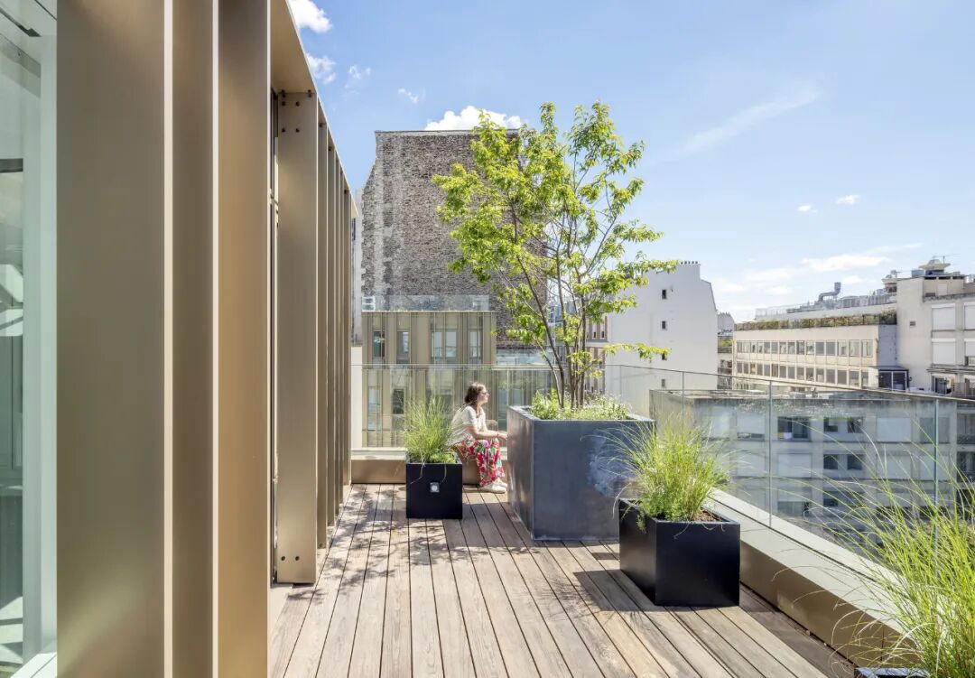 Accessible or not, all the roofs are planted with large vegetal carpets. The accessible terraces, true places of life, are spread on both sides of the garden and offer large spaces to exchange, work outdoors, or have lunch. Finally, the terrace of the «Nuage» (Cloud), at the top of the building, offers an exceptional panoramic view of all of Paris near the Champs Elysees.