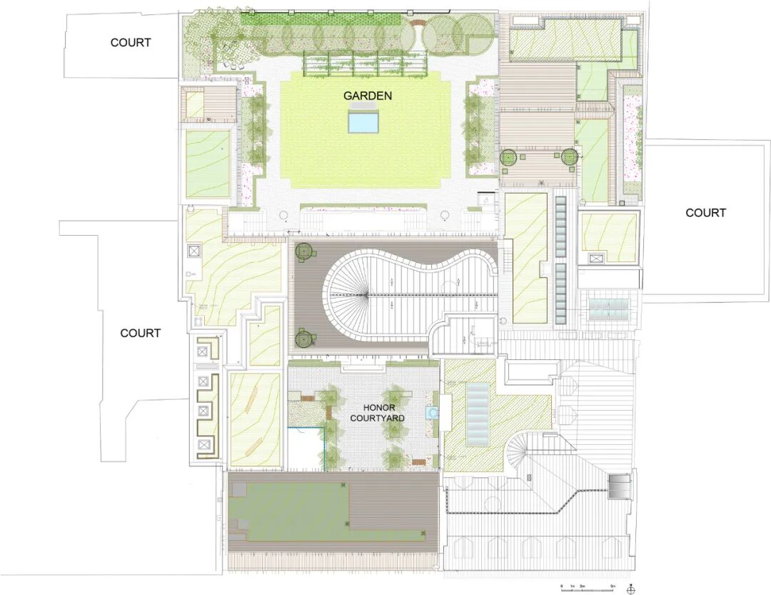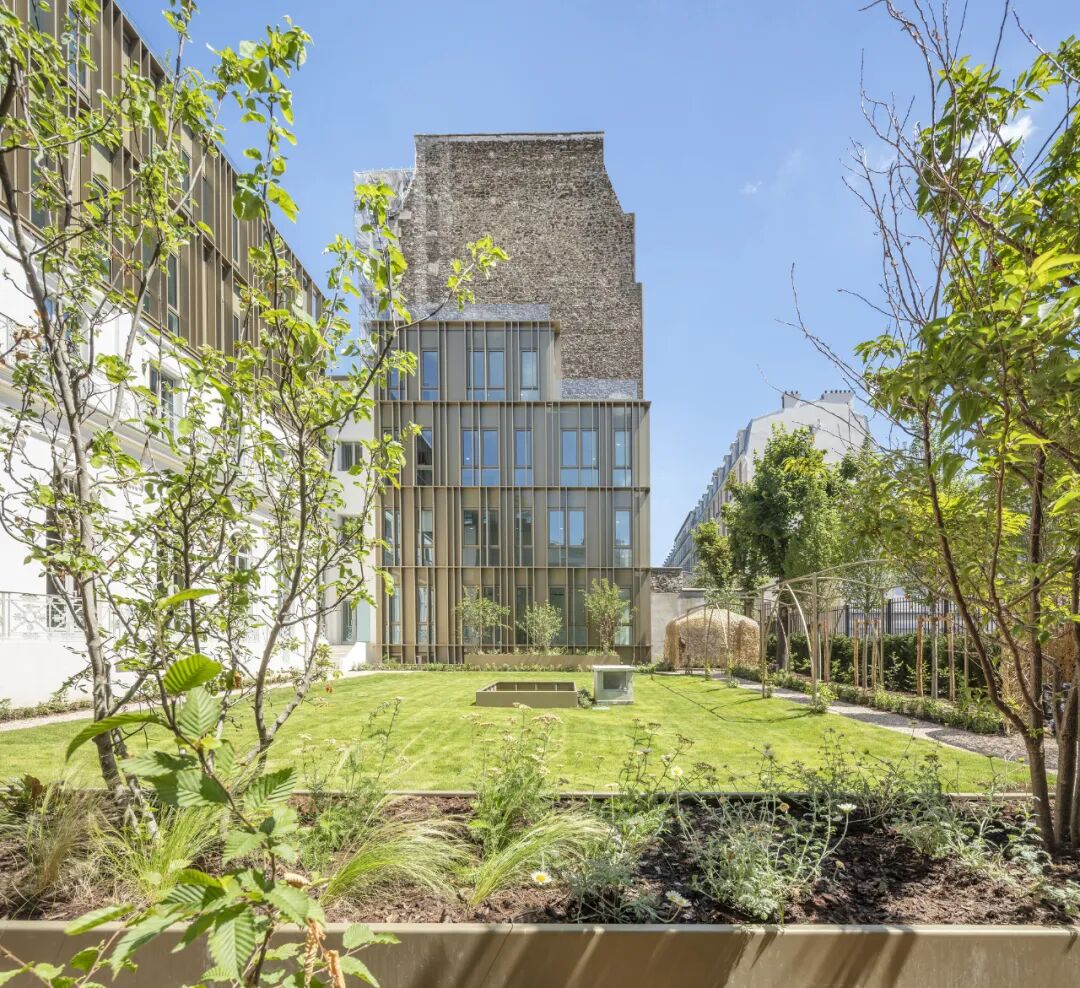 The garden, a listed green space of 500 m² facing south, is framed by the «garden front» of the hotel particulier and its two new contemporary wings. The aim is to recreate a traditional French garden, focused on the historical façade, but the lack of historically documented information on the garden allows a free interpretation of it. It is not a restoration but rather a creation where the classical motifs take on a modern materiality: symmetry, fountains, flowering beds, a central lawn, a frame of low-cut hedges, and a pergola for old roses.