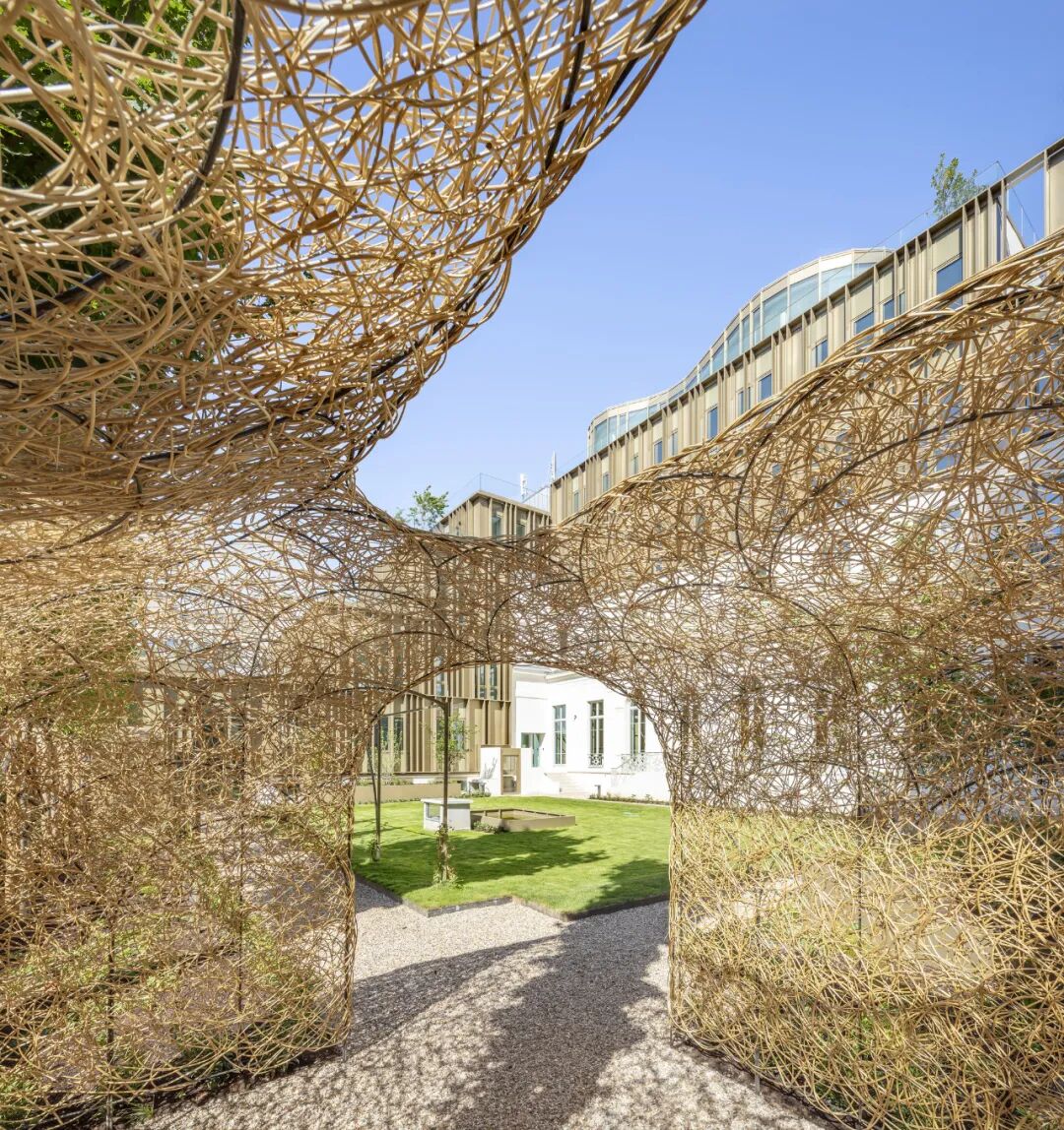 With a contemporary aspect, the facades of the new buildings are composed of large glass panels surrounding and highlighting the renovated existing structures. A vertical mesh unfolds along the façade on the street, on the main courtyard, and around the garden. Expressing the building’s essence, the mesh weaves the link between the different spaces and temporalities. The all-around glazing and the particularly open façade rhythm promote natural lighting on all workstations. Above the Hotel Particulier, two levels were created, including the 5th floor, the Nuage (the cloud), a space in the attic glazed to all heights, bathed in light, and surrounded by terraces that overlook the mansion and the garden; the space between sky and earth is quite singular.