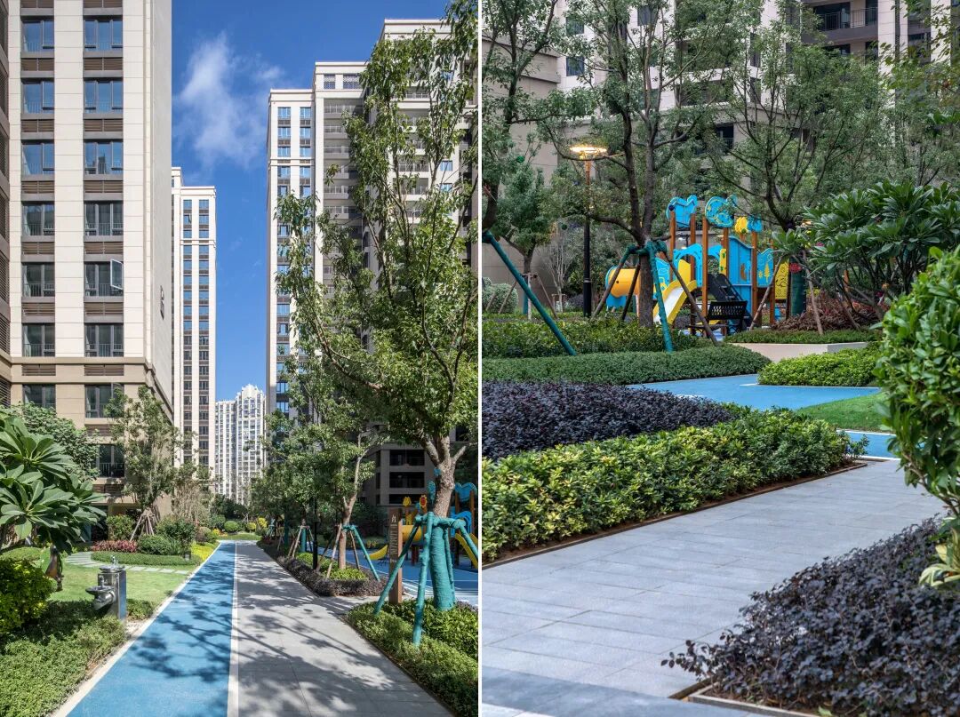 温馨归家路:提供园区环跑道的运动天地,给到业主另一种活动功能的补充。充分利用消防扑救面的硬质铺装,用地面刻画、标识标语的方式,打造活力共享的运动空间。