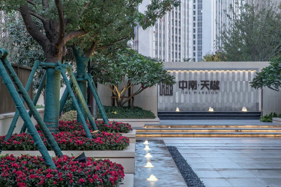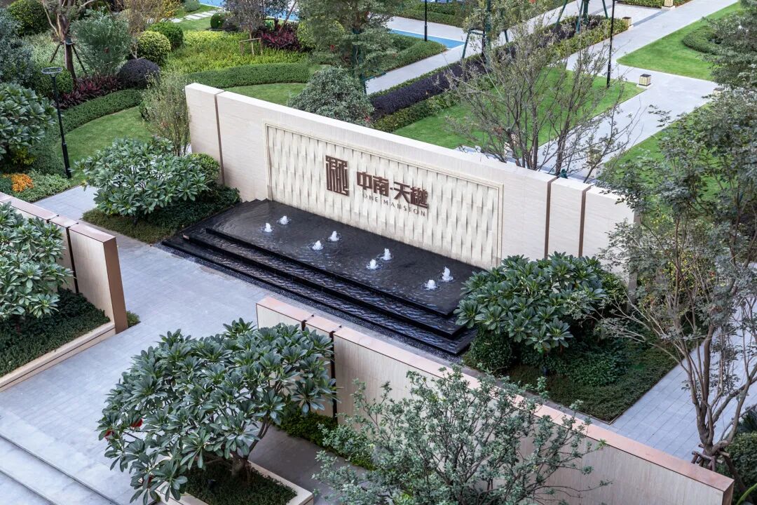 精致的礼仪轴线:进入社区,映入眼帘的是一副与外部截然不同的精致画面,中远的水景景墙形成对景,两侧的水景边界营造了丰富的层次感,衬托出天樾的品质与奢享。