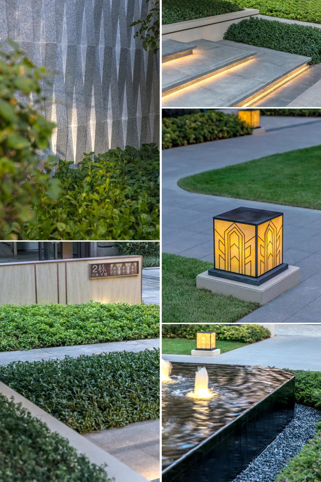 本案于现代典雅的气质中凝练出人居的美感,创造出独属于晋江的城市风景,并成为业主人群的品质代言。通过景墙与水景的围合,各个景观小品的选区与摆放,多种乔木与地被的搭配等,充分诠释了设计者在现代审美与功能结合上的思考。