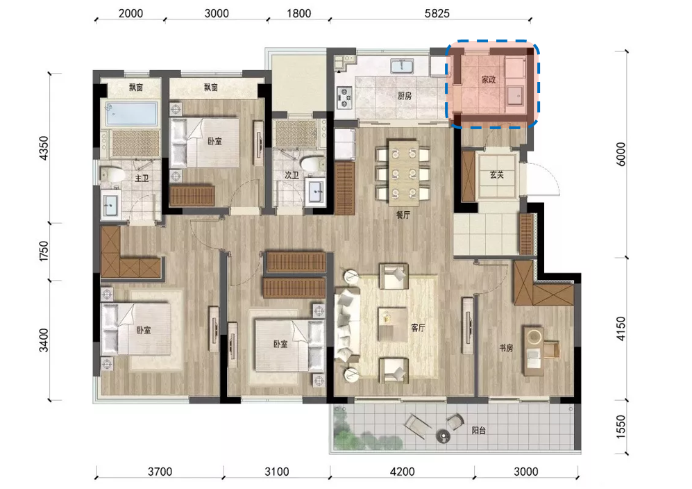 空间功能更加精细,独立的家政空间偏安一隅,作业时间也不会干扰家人休息或聊天。