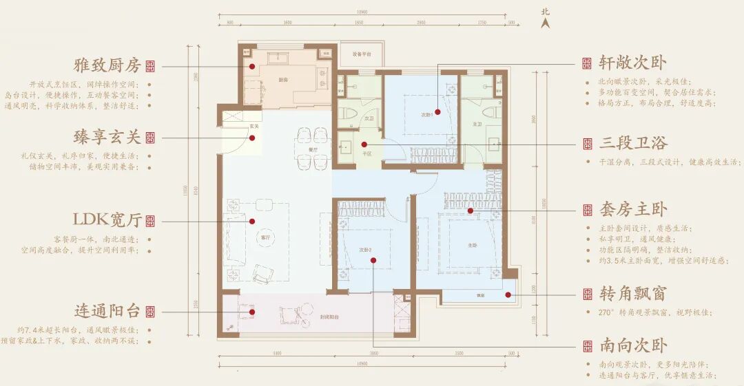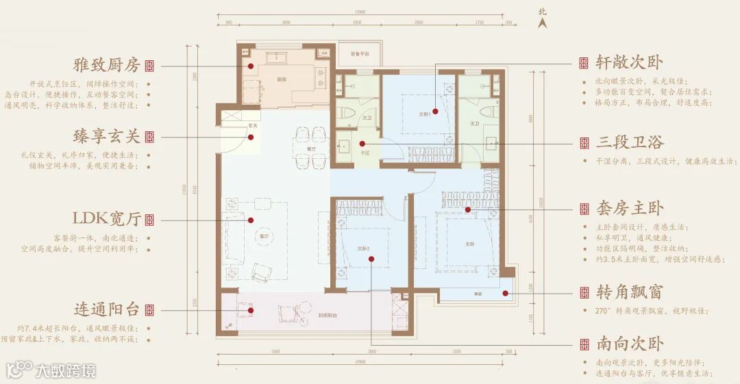 南京万科·朗拾建面约139㎡3室2厅2卫户型,是真正的改善大三房,南向宽厅长约6.5米,可以打造成客厅+书房,或者客厅+活动区,完全根据家庭需求来灵活规划。中西双厨、餐客厨阳台一体化设计,是整个家庭的活动展示面。