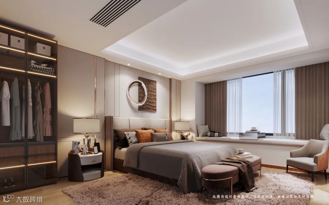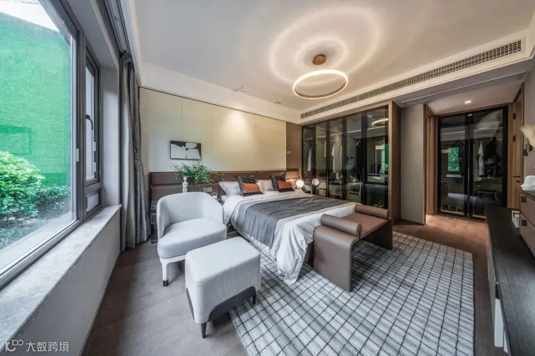 这样的尺度感,对标同类产品,需要建面约143㎡、甚至建面约150㎡才能实现。主卧酒店式套房设计,私享独立卫浴间与衣帽间,开间约3.4米,进深约8.6米,整体主卧面积约22㎡左右。