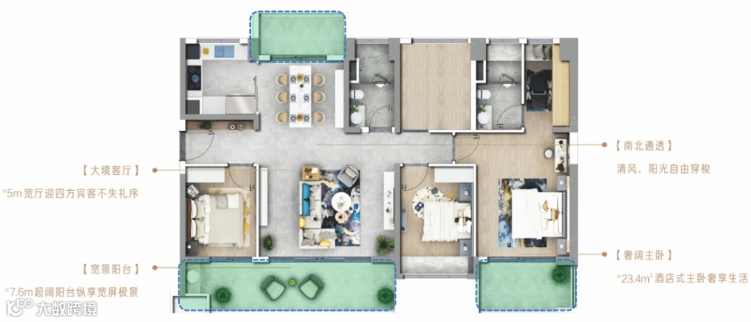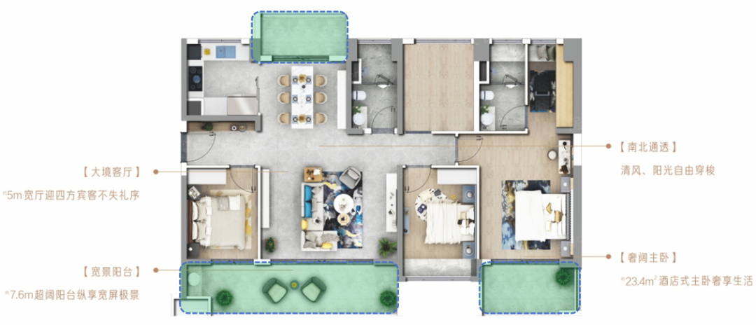 万科精心考量阳台与客厅的连接性,延伸客厅空间至约7.6米阳台,实现开窗即感四季变化,且最大化保证空间的光照和对流,加大了客厅的空间感,全明通透。